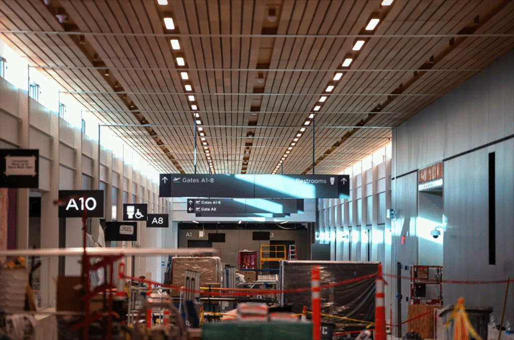 Inside the skeleton of the roughly 1 million square-foot terminal, more than half of the artwork — created by multiple artists after an intensive selection process — has been installed. Two moving walkways will expedite transfers between two concourses. There are a total of 39 gates.