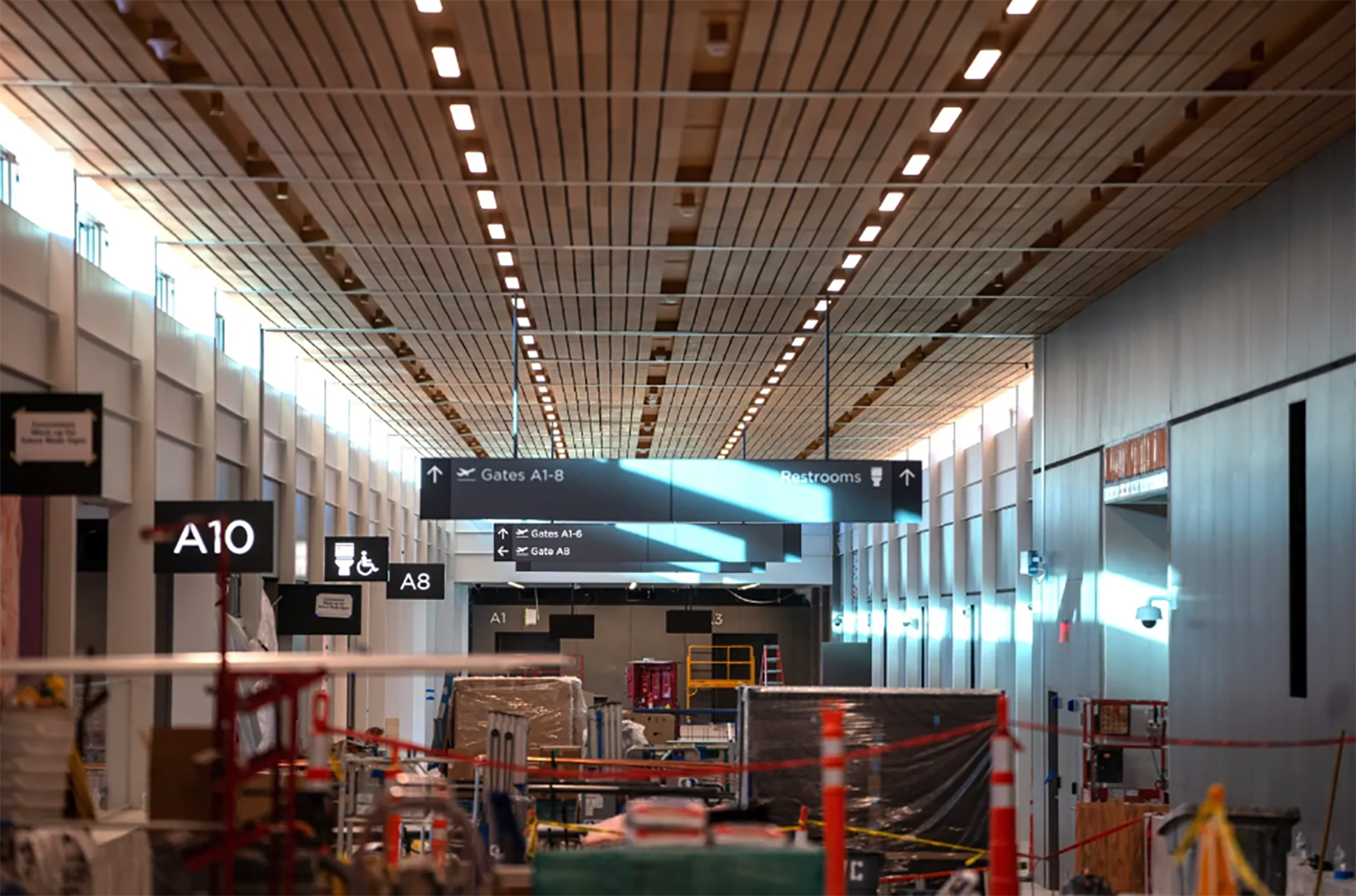 As visitors exit the aircraft, they will be greeted by all-glass jet bridges. Inside the terminal, visitors will encounter terrazzo floors and warm, open hemlock wood ceilings.