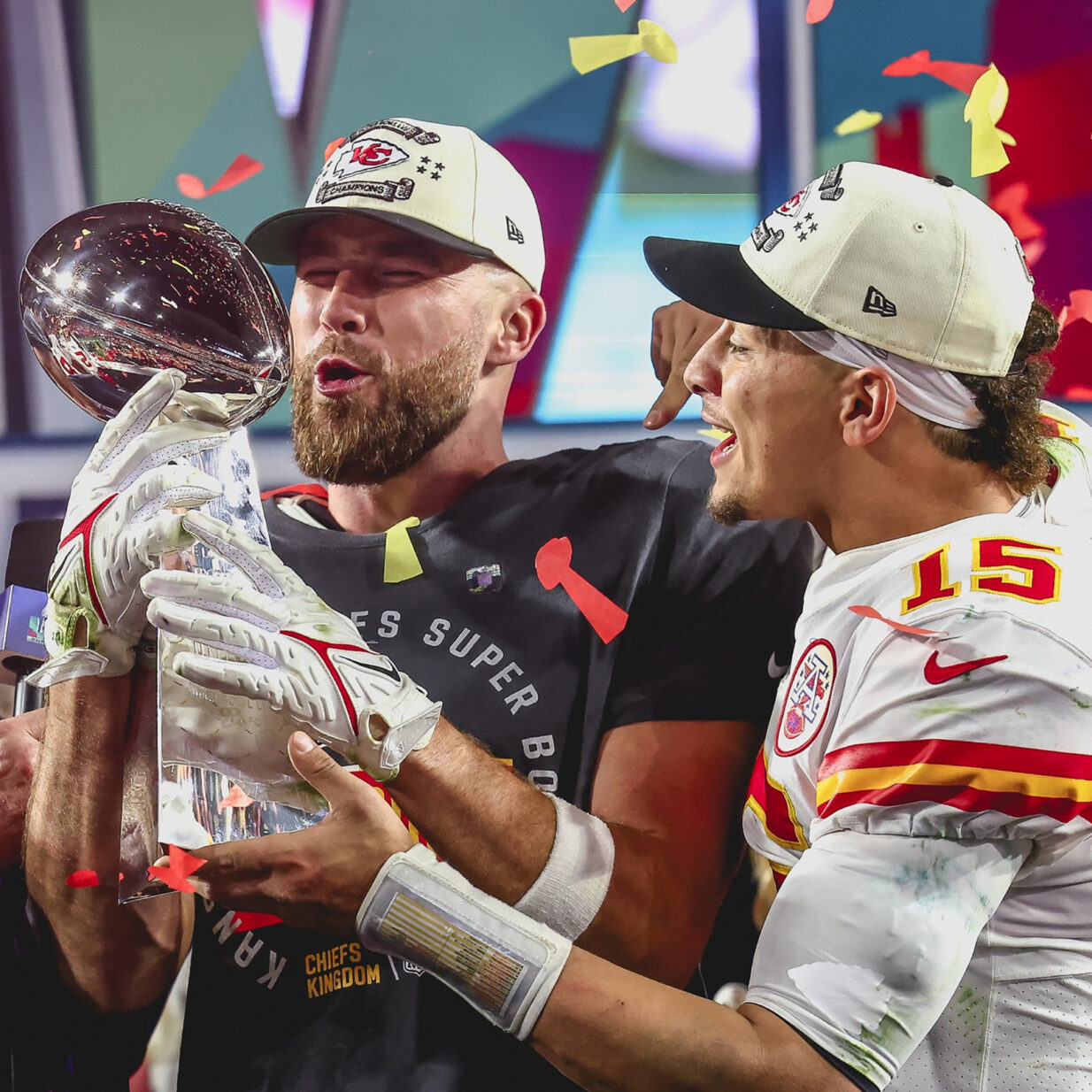 Travis Kelce and Patrick Mahomes hold the Lombardi Trophy after winning the Super Bowl in February; photo courtesy of the Kansas City Chiefs