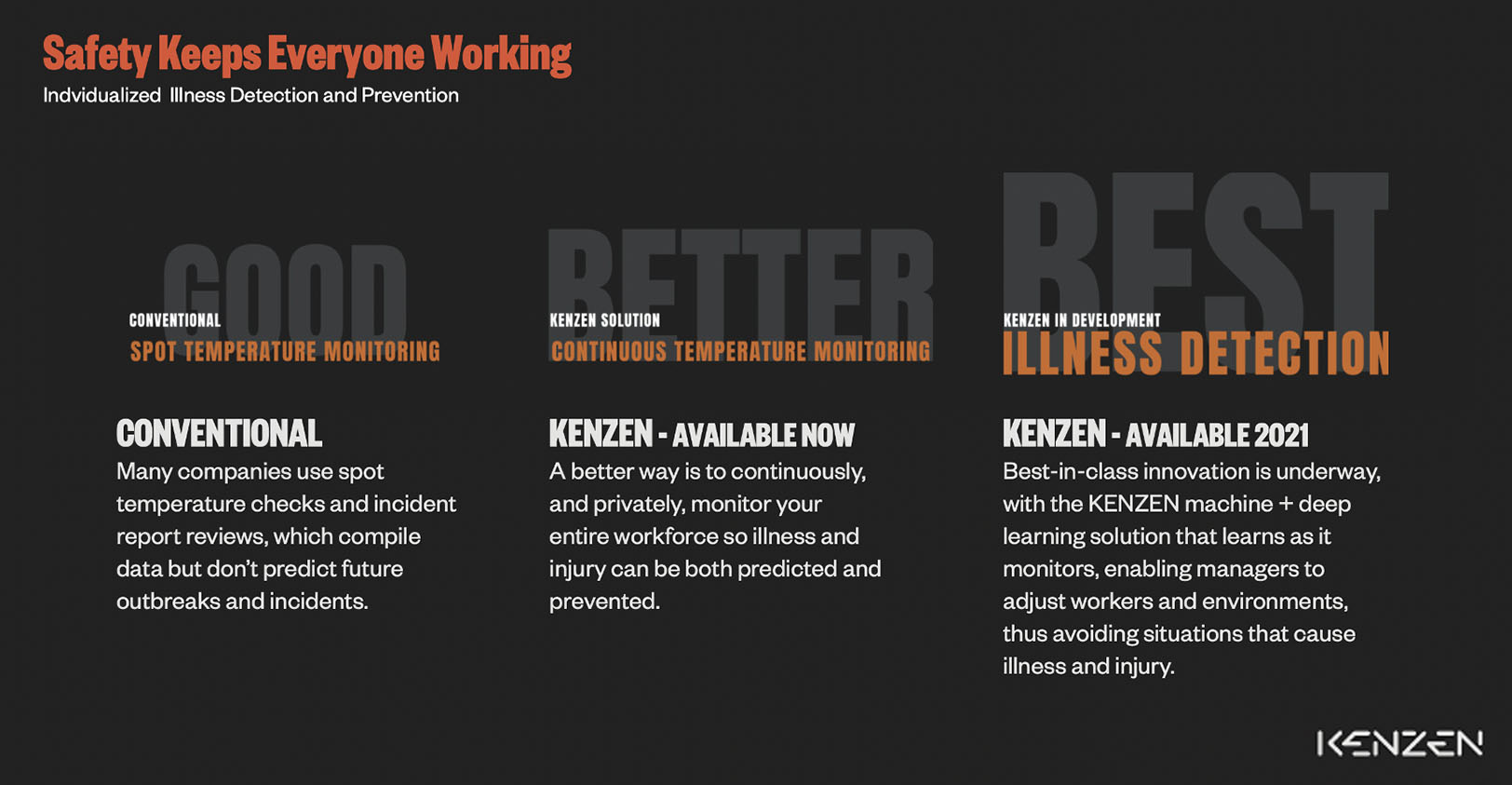 “Illness detection will catch workers pre-contagion before they enter a site where they then have further medical screening, ascertain exactly what they had — whether it’s COVID or flu or TB,” she explained of in-the-works plans and expanding innovation that also includes continuous temperature monitoring.