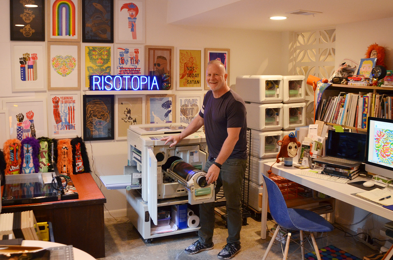 “Some men get to a certain age and go buy a motorcycle or boats, and I went out and bought a Risograph printer,” the veteran graphic designer and founder of Risotopia said, describing his investment in a pricey piece of 35-year-old technology that offsets its printing limitations with vibrant, distinctive results.
