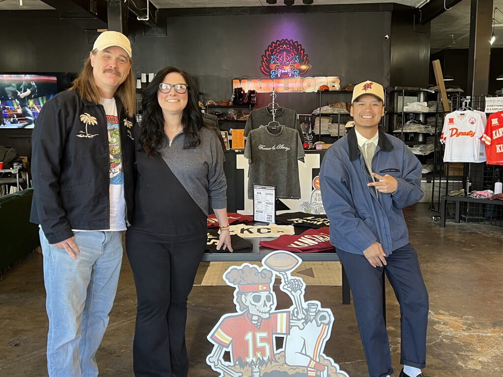 Johnny and Michele Dawbarn, SewKC, with Jesse Phouanphet, MADE MOBB, at MADE MOBB’s storefront in the Crossroads; photo by Taylor Wilmore, Startland News
