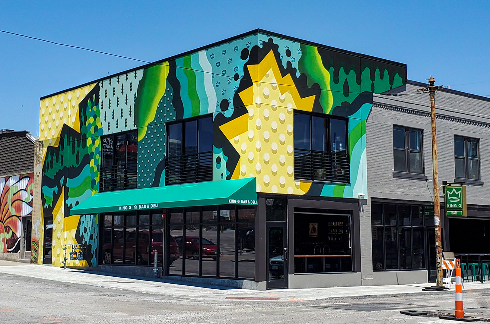 The vibrant colors of the King Me mural grab patrons’ attention, luring them into the calm, moody scene on the space inside.