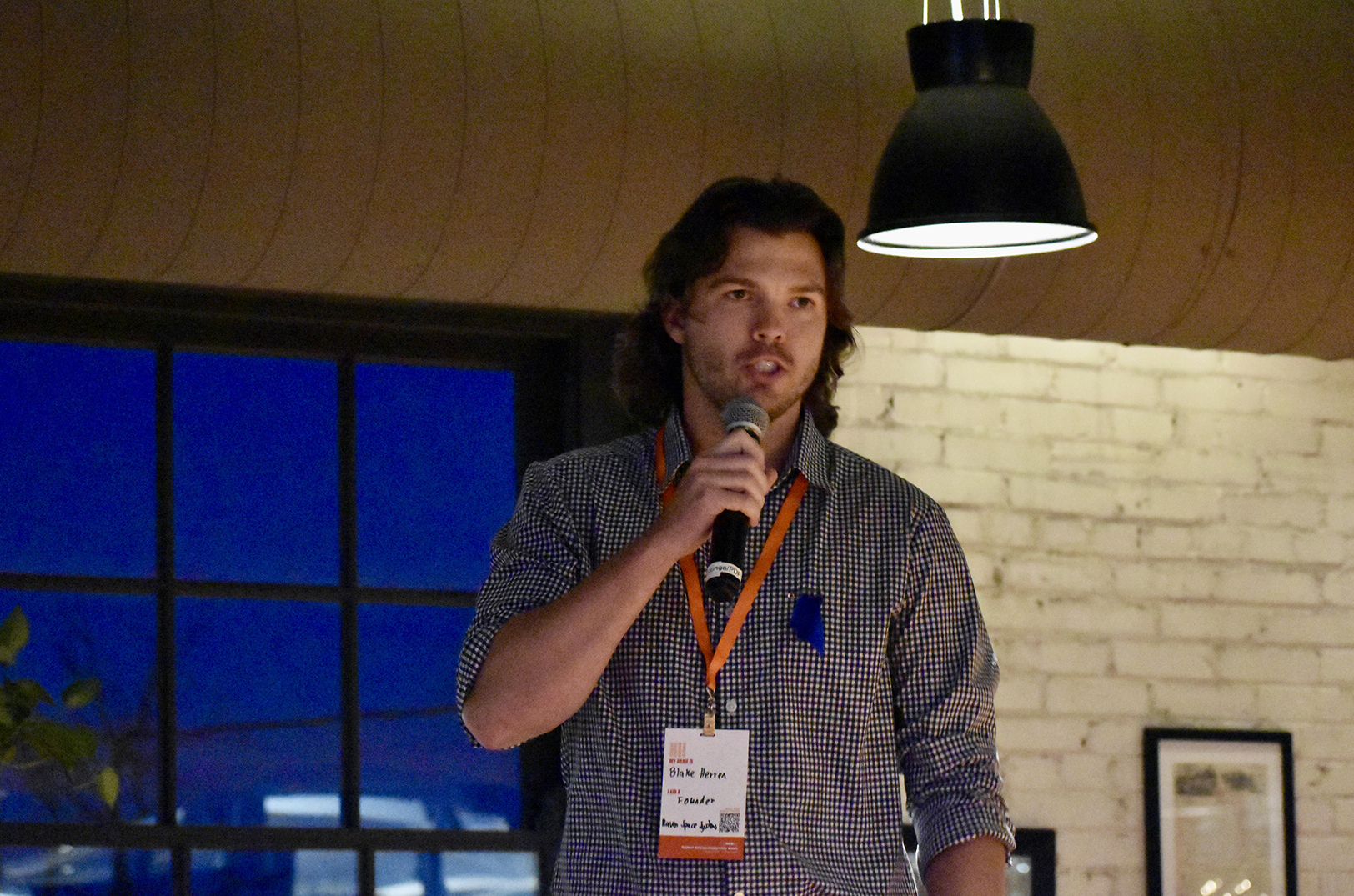 Blake Herron, Raven Space Systems, delivers his pitch in November 2023 at the LaunchKC Liftoff celebration during Global Entrepreneurship Week-Kansas City; photo by Nikki Overfelt Chifalu, Startland News