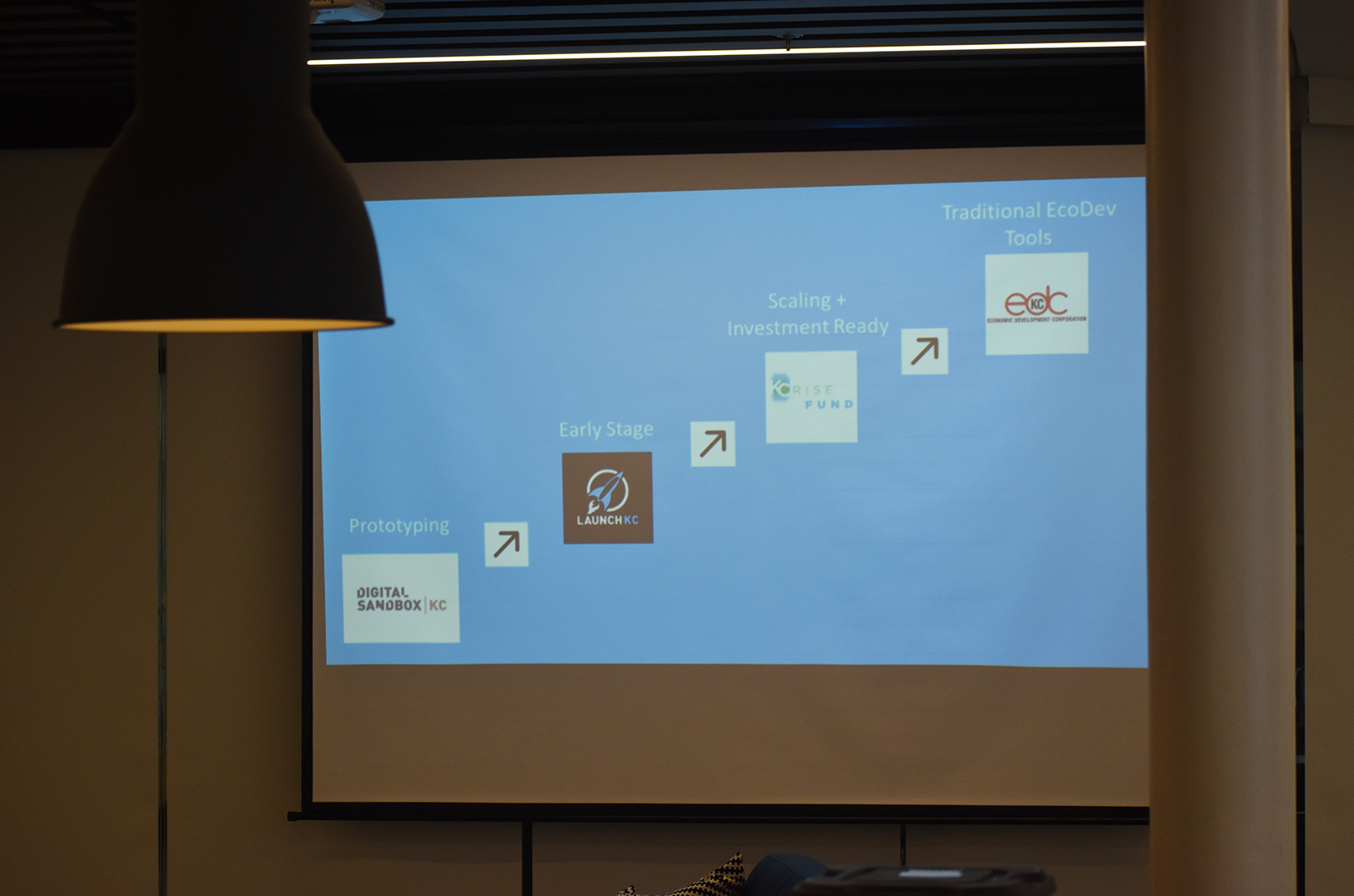 A slide from a LaunchKC presentation during 1 Million Cups Kansas City at the Offices at Park 39; photo by Taylor Wilmore, Startland News