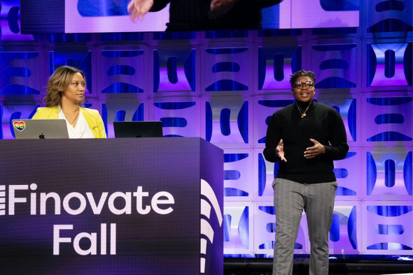 Jannae Gammage, Cyphr, right, pitches her startup alongside co-founder Alaia Martin at the Finovate Fall conference in New York City; photo courtesy of Cyphr