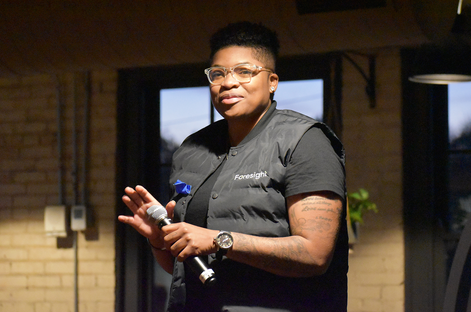 Jannae Gammage, Cyphr, gives her pitch during a LaunchKC showcase in November 2023; photo by Tommy Felts, Startland News