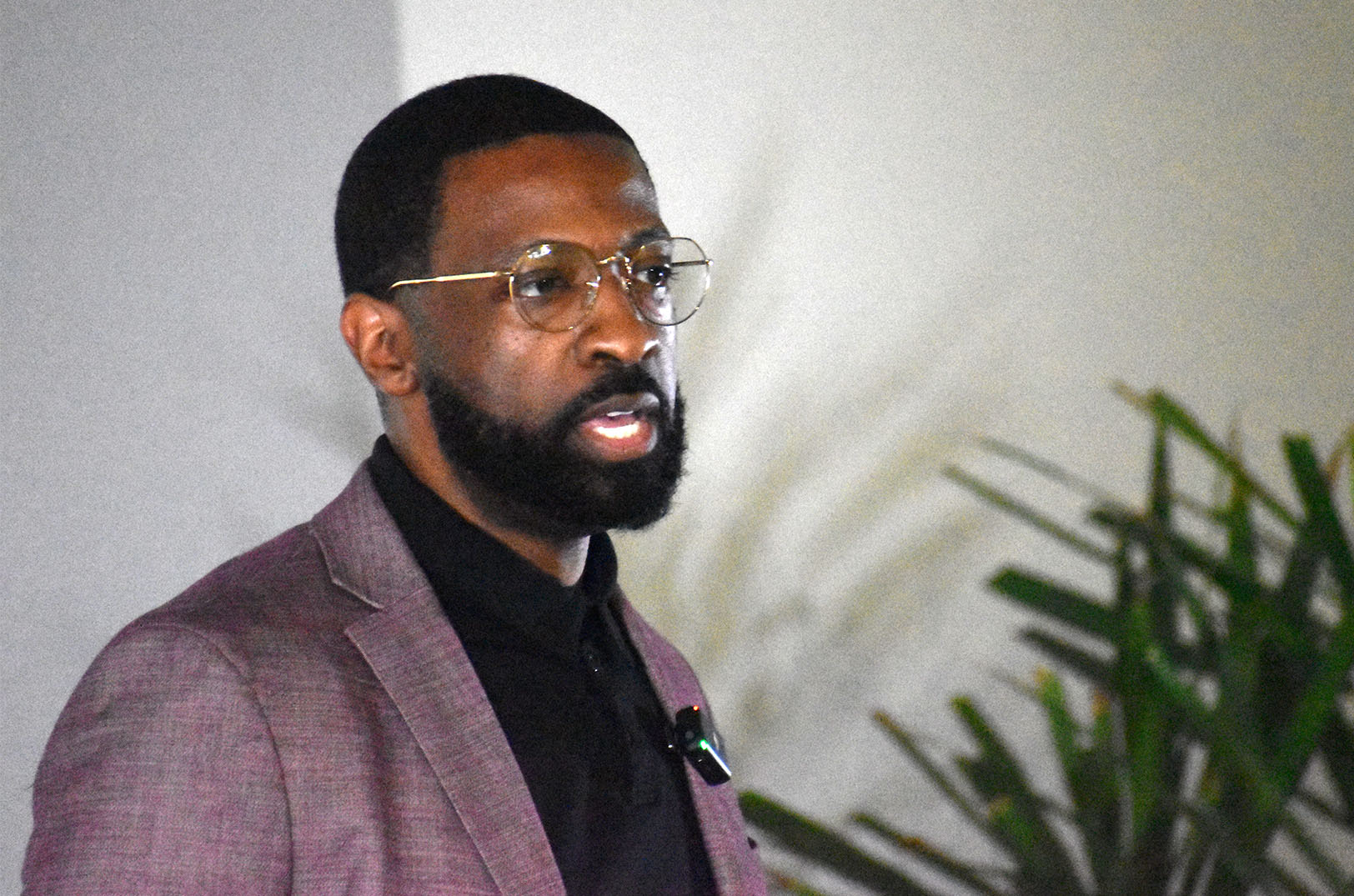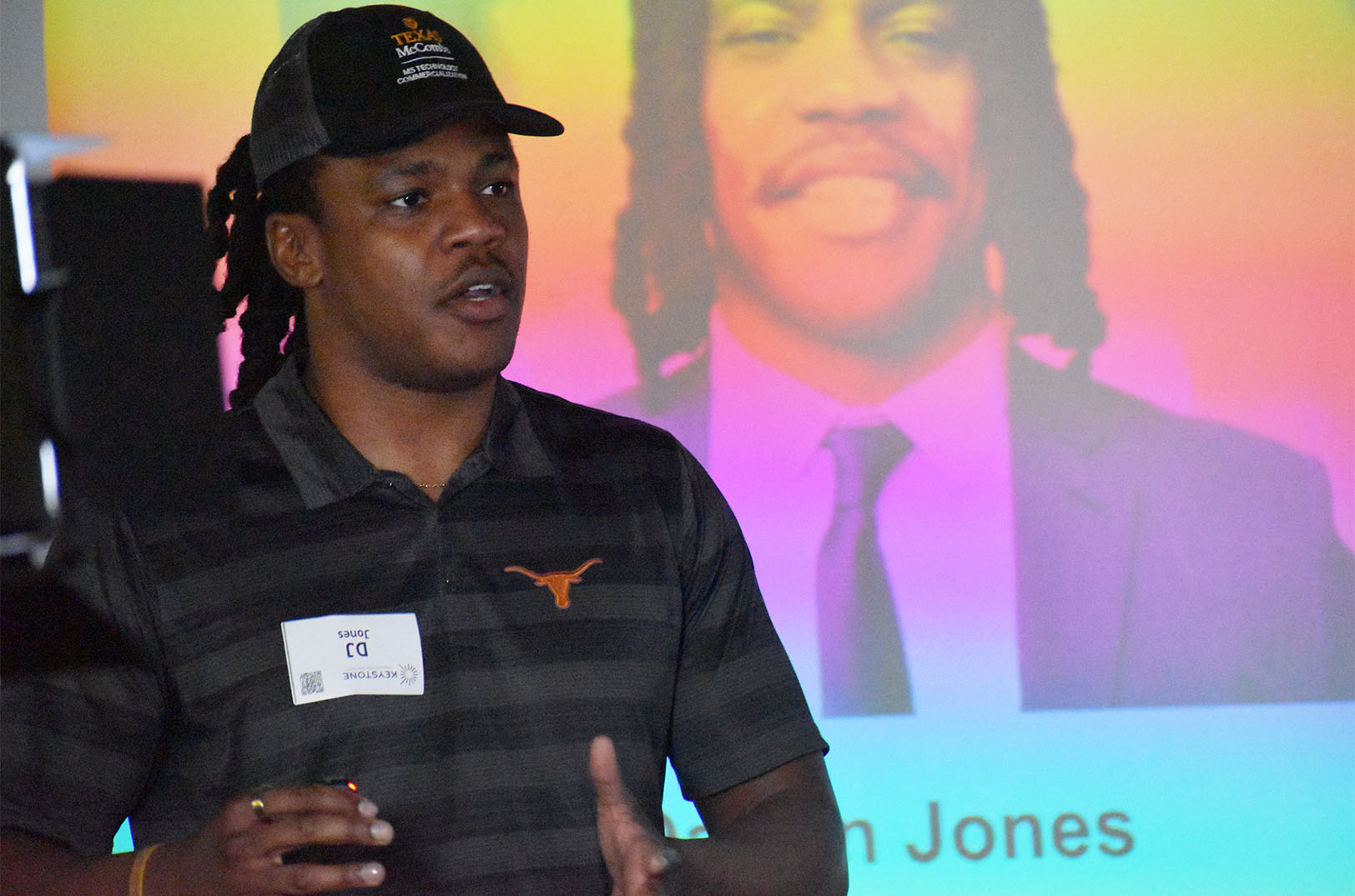Darian Jones, Tribal Tech Innovations, shares his startup pitch during the reveal event for the 2025 LaunchKC Social Venture Studio cohort; photo by Taylor Wilmore, Startland News