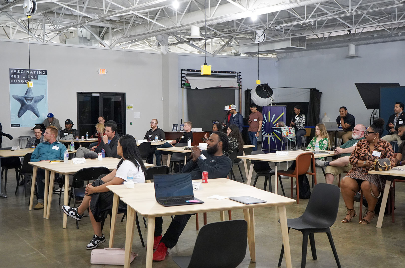 Members of the cohort and community members listen to startup pitches during the 2025 LaunchKC Social Venture Studio reveal event; photo by Brian Escobar, EDCKC