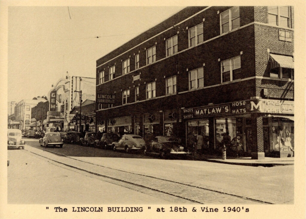 The Lincoln building, built in 1921, was a cornerstone of 18th and Vine commerce. On its ground floor, it housed the Lincoln Furniture Company and Matlaw’s, a men’s clothing store. In addition to office space, the building also hosted Lincoln Hall, a music and dancing venue. Later, in the 1940s, the Kansas City Monarchs baseball team set up offices in the space.