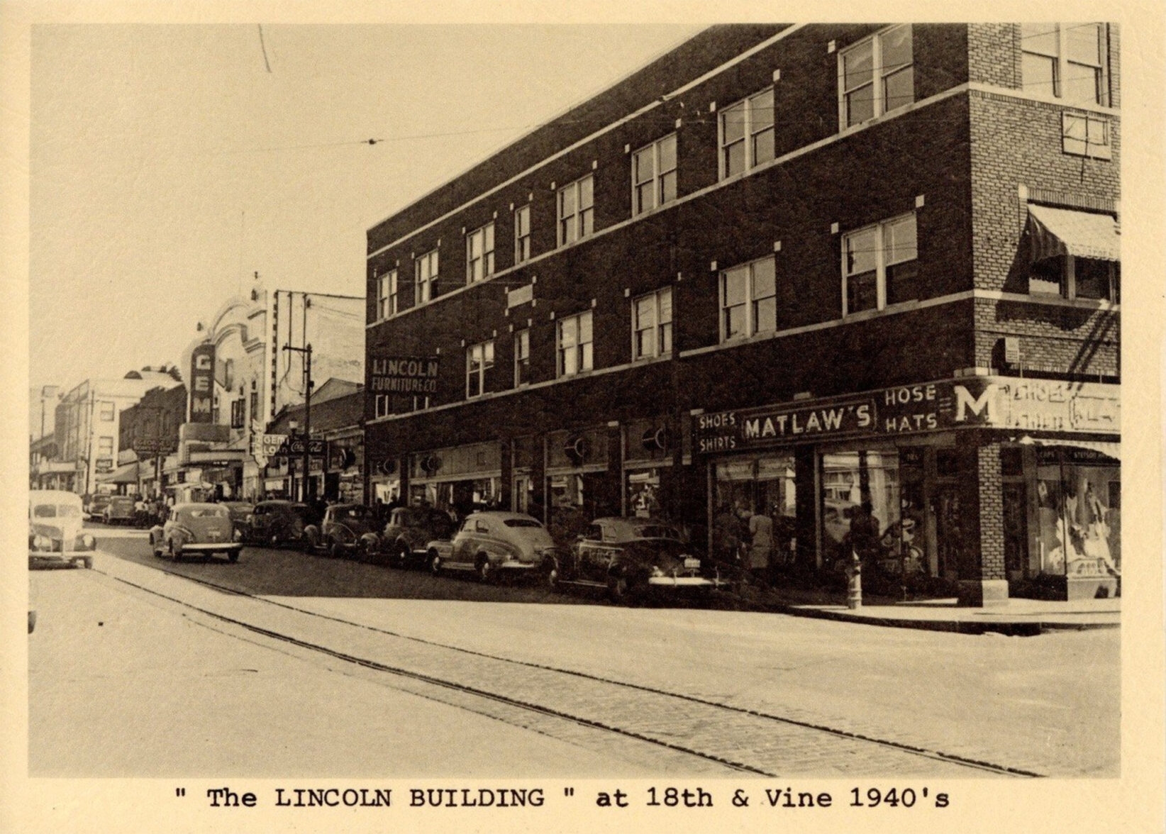 The Lincoln building, built in 1921, was a cornerstone of 18th and Vine commerce. On its ground floor, it housed the Lincoln Furniture Company and Matlaw’s, a men’s clothing store. In addition to office space, the building also hosted Lincoln Hall, a music and dancing venue. Later, in the 1940s, the Kansas City Monarchs baseball team set up offices in the space.