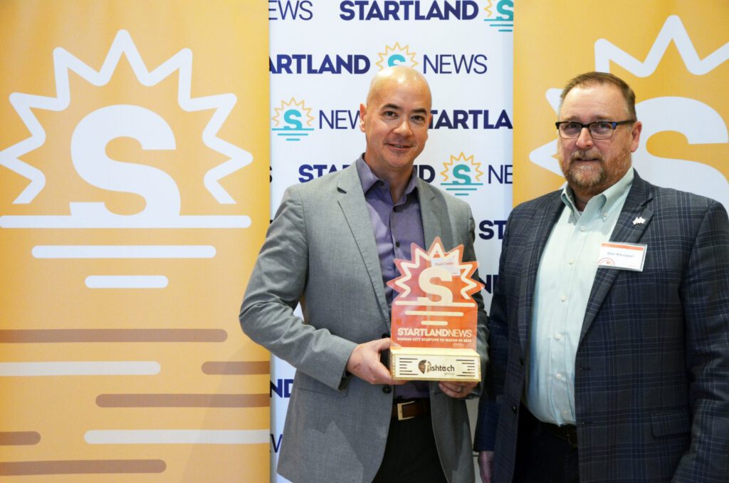 Chuck Crawford, then-CSO and co-founder of Fishtech Group, and Don Kleoppel, then-chief security officer for Cerner, pose together after Fishtech Group was honored as one of Startland News’ Kansas City Startups to Watch in 2020; photo by Tommy Felts, Startland News