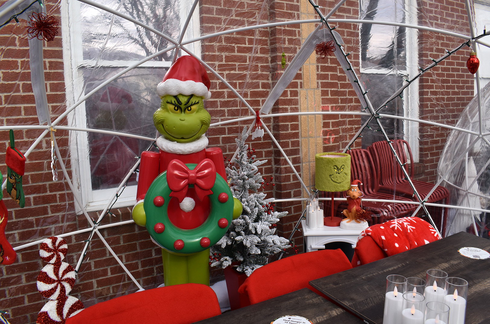 A Grinchy look at one of the holiday igloos outside Lulu’s Thai Noodle Shop in Overland Park; photo by Taylor Wilmore, Startland News
