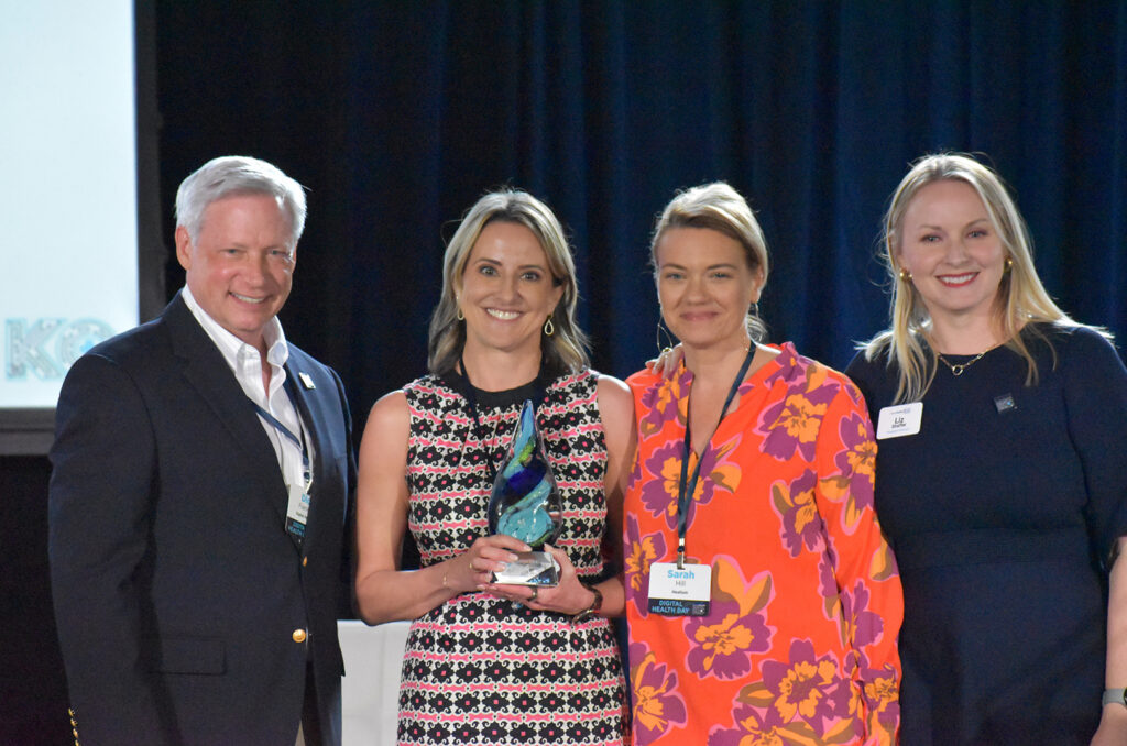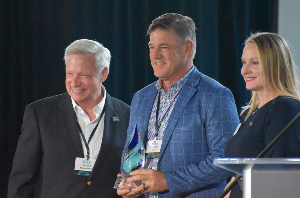 Dick Flanigan and Liz Shaffer, Digital Health KC, present Mike Valentine, Netsmart, center, with the Corporate Visionary Award during the Lumi Awards at Digital Health Day; photo by Tommy Felts, Startland News