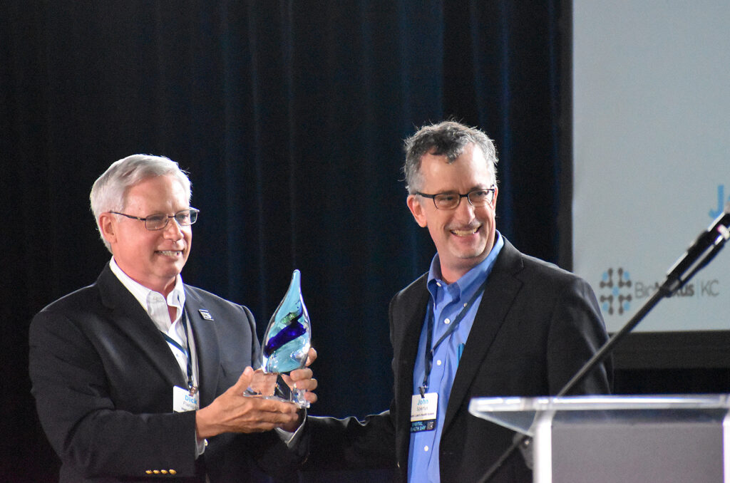 ick Flanigan, Digital Health KC, presents Dr. John Spertus with the Digital Pioneer Award during the Lumi Awards at Digital Health Day; photo by Tommy Felts, Startland News