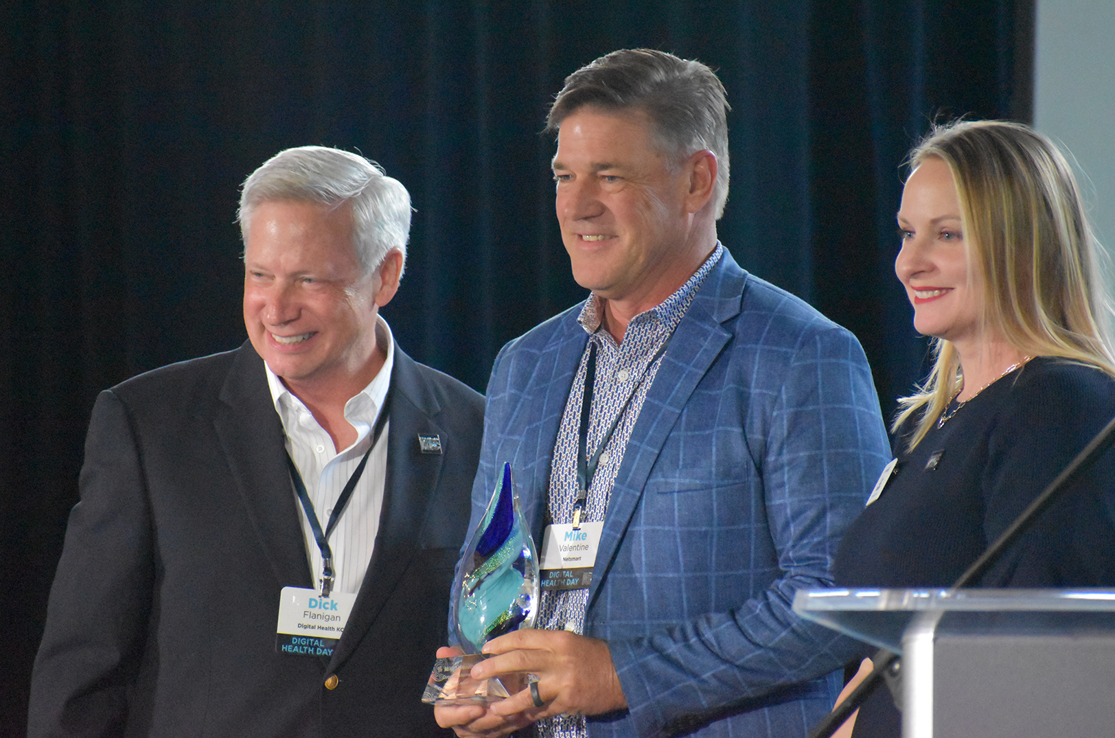 Dick Flanigan and Liz Shaffer, Digital Health KC, present Mike Valentine, Netsmart, center, with the Corporate Visionary Award during the Lumi Awards at Digital Health Day; photo by Tommy Felts, Startland News