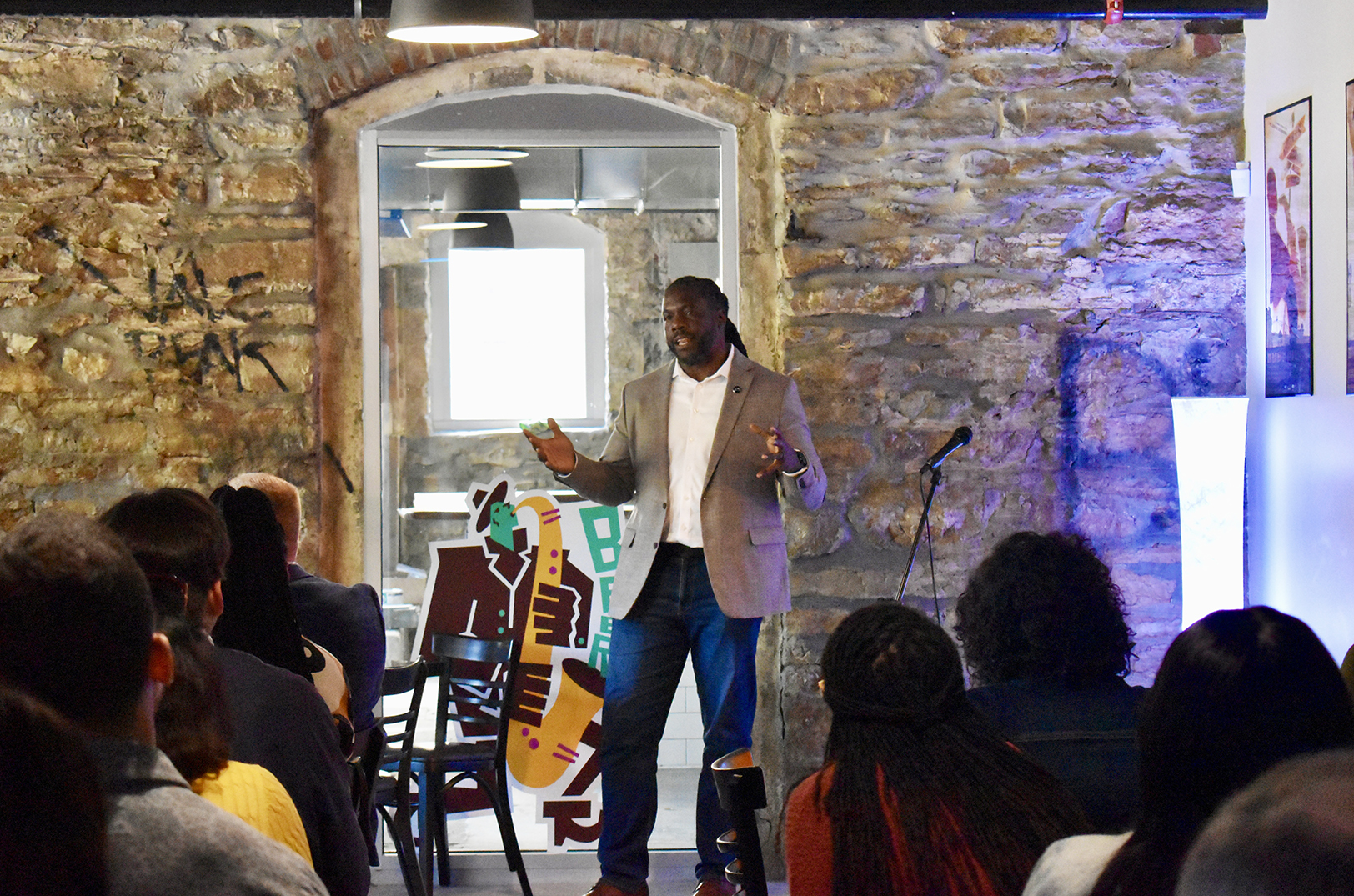 Marcus Whitney, Jumpstart Health Investors, speaks at Vine Street Brewing during BioNexus KC’s luncheon on investing in Black and Brown innovators; photo by Nikki Overfelt Chifalu, Startland News