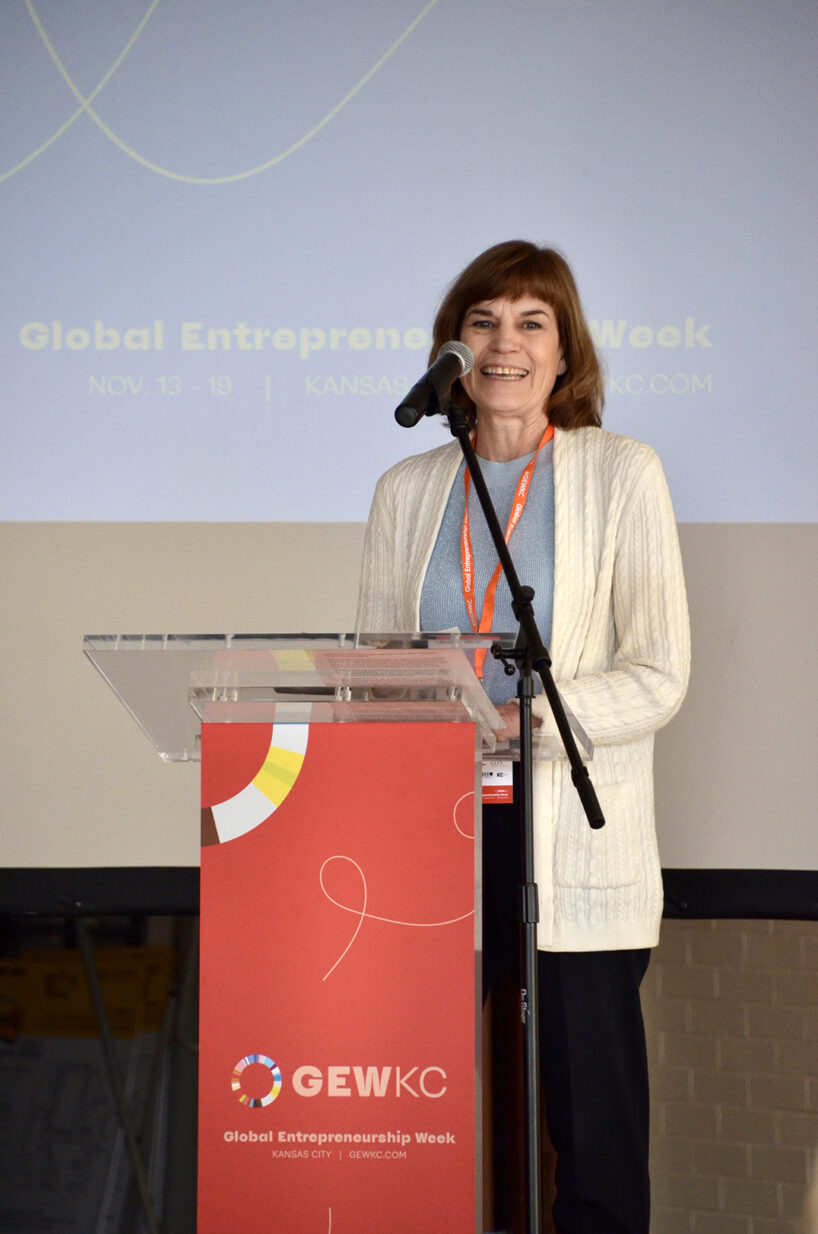 Maria Meyers, UMKC Innovation Center, speaks during ESO Day in November 2023 at The Offices at Park 39 amid Global Entrepreneurship Week-Kansas City; photo by Tommy Felts, Startland News