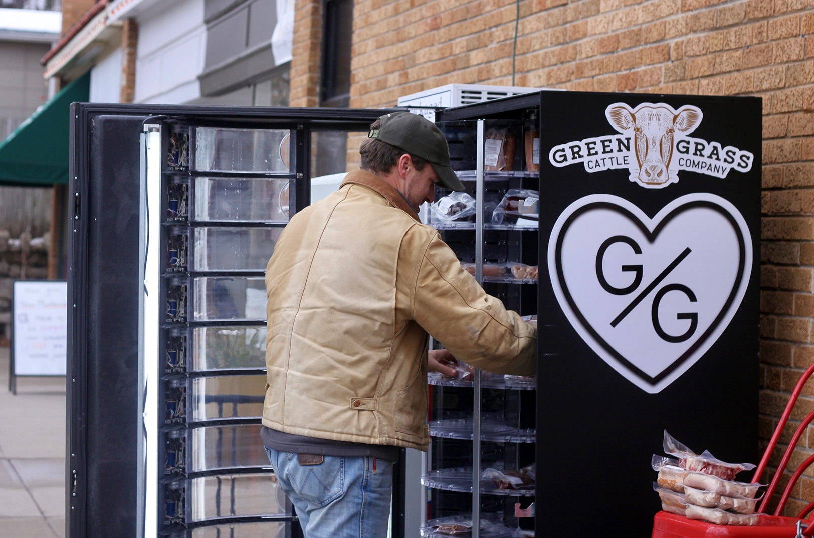Tim Haer stocks a beef vending machine from Green Grass Cattle Company outside Front Range Coffeehouse and Provisions