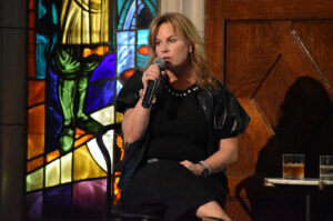 Maggie Kenefake, Iron Prairie Ventures, and Brian Scharf, the Ewing Marion Kauffman Foundation, share a fireside chat on stage at Mid x Midwest; photo by Taylor Wilmore, Startland News