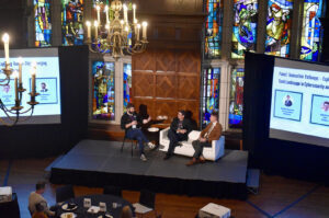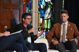 Chris Simpson, Polsinelli, leads a panel conversation with Jody Brazil, FireMon, and Daniel Kennedy, BioNexus KC, at Mid x Midwest; photo by Taylor Wilmore, Startland News