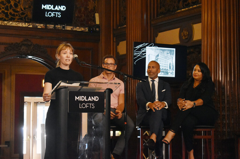 Alexis Oppenheimer, Helix Architecture + Design, speaks during a celebration event marking the commencement of renovations at the former Midland office building; photos by Channa Steinmetz, Startland News