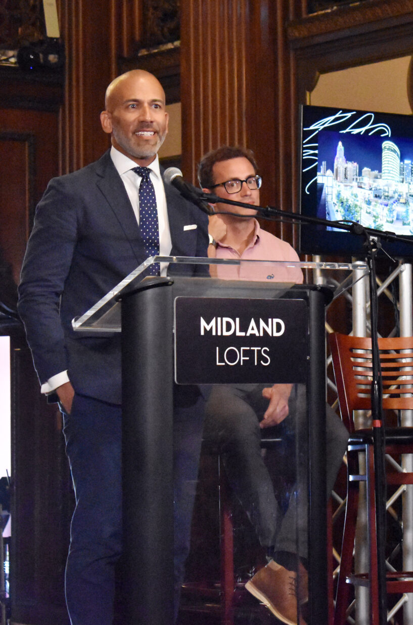 John Moncke, president of Kansas City Power & Light District, speaks during a celebration event for Midland Lofts
