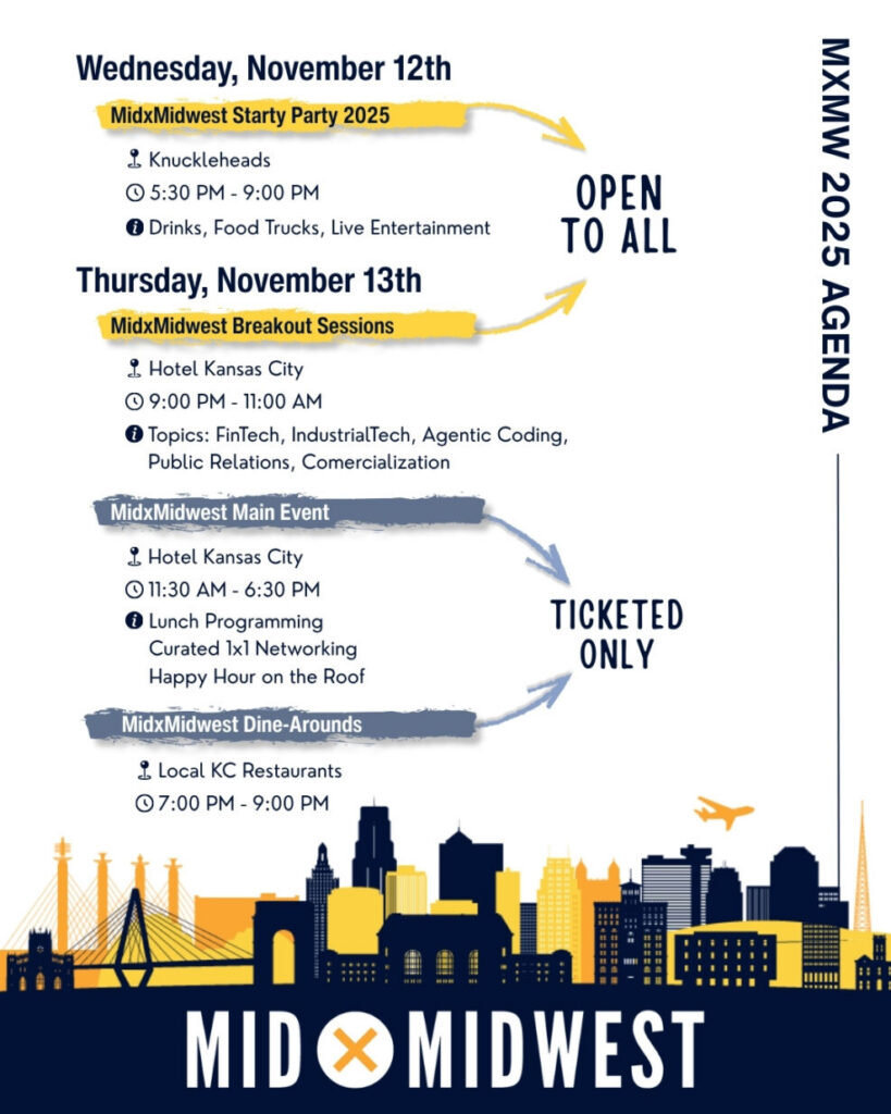 “The goal of MidxMidwest is to create the connective tissue between founders, investors, and corporates so opportunities flow faster,” said Heying, head of platform at Flyover Capital and lead organizer of the Nov. 12-14 event. “Every new relationship built here strengthens the foundation for what the Midwest can become as a tech economy.”