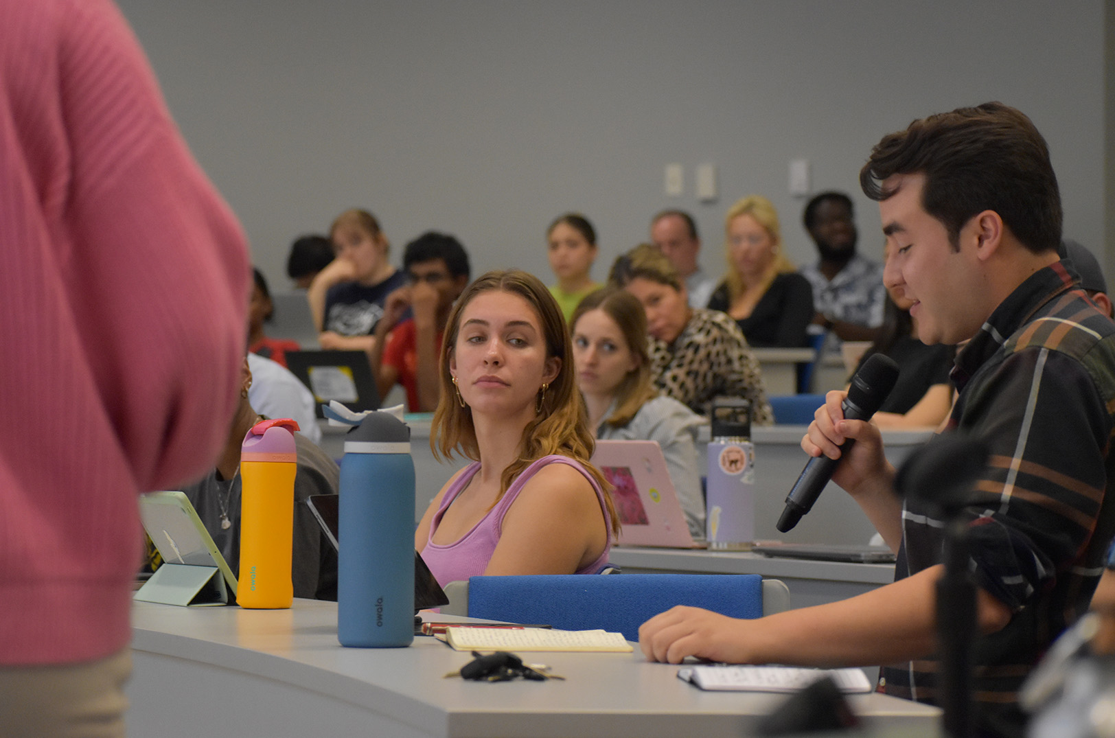 Spencer Claiborne asks Mike Plunkett a question during a Q&A portion of UMKC’s Entrepreneur Speaker Series; photo by Taylor Wilmore, Startland News