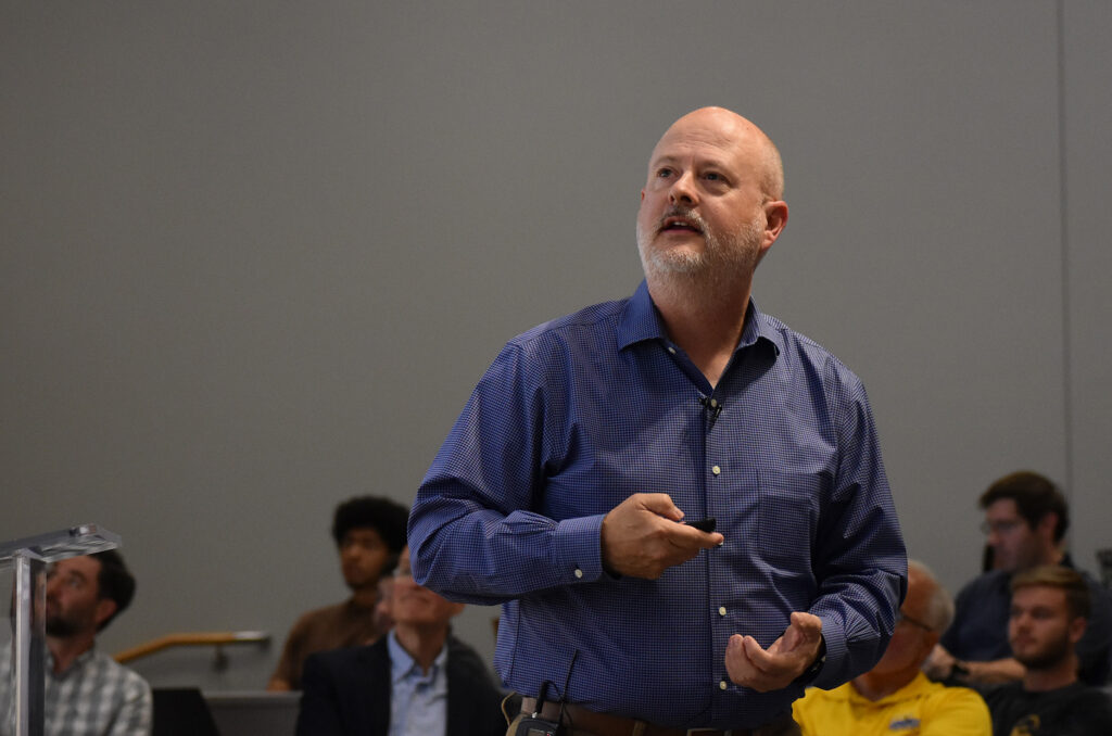 Mike Plunkett, PayIt, speaks to a crowd of students gathered Tuesday for UMKC’s Entrepreneur Speaker Series; photo by Taylor Wilmore, Startland News