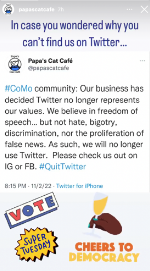 Papa’s Cat Cafe in Columbia posted on its Instagram story earlier this month that it left Twitter. Screenshot of @papascatcafe on Instagram