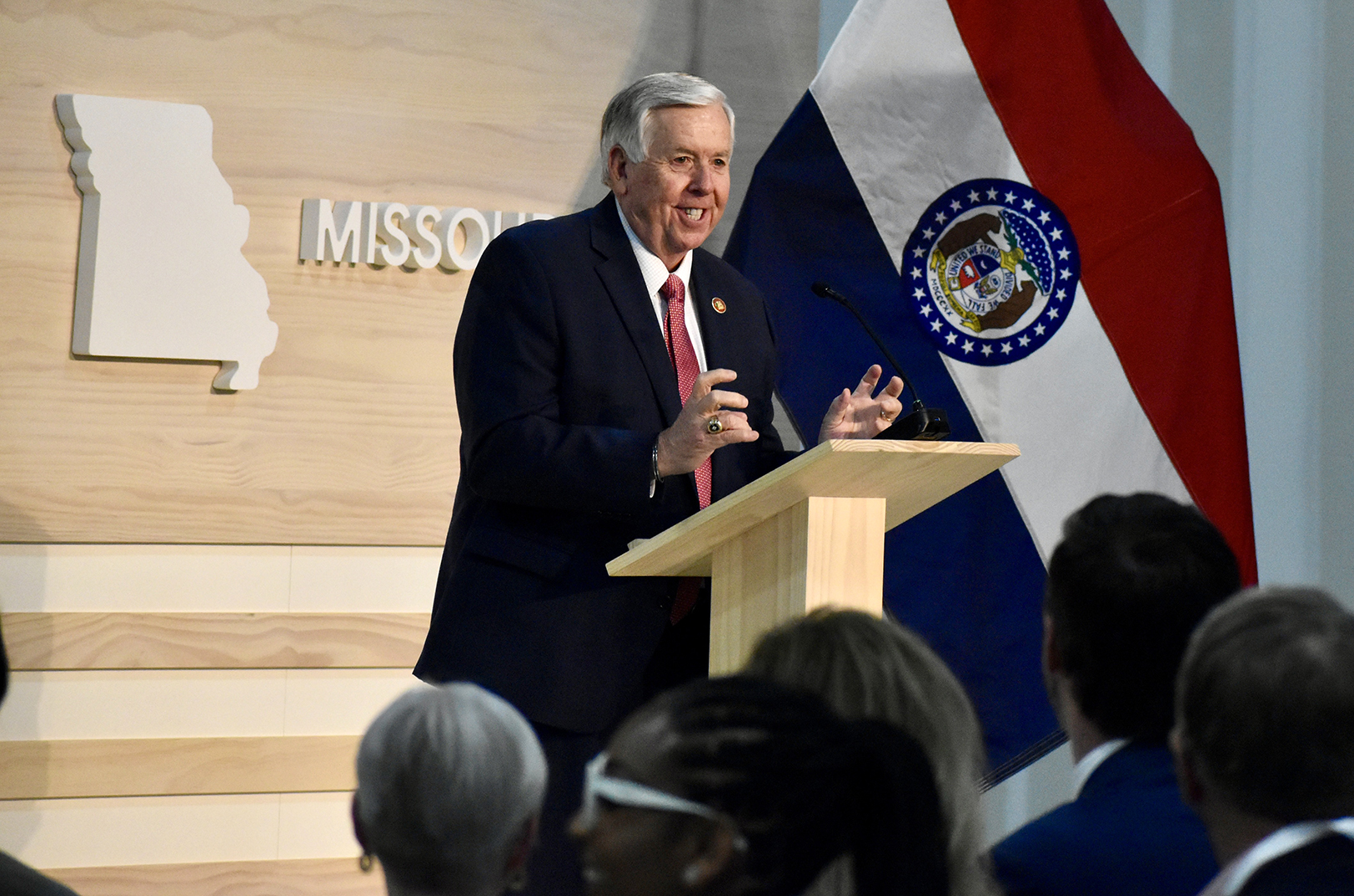 Gov. Mike Parson, R-Missouri, speaks at Union Station in Kansas City, March 2024; photo by Nikki Overfelt Chifalu, Startland News