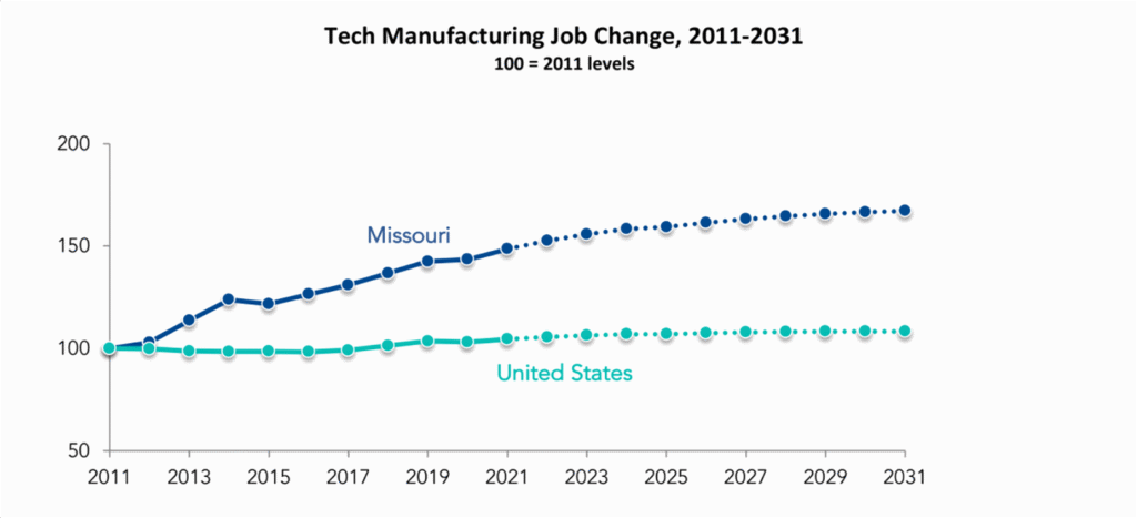 Missouri’s IT sector is projected to grow by 11.6 percent over the next five years, according to the report, with tech manufacturing expected to grow by nearly 12 percent. (Nationally, tech manufacturing has decreased over the last five years, while tech manufacturing in Missouri grew by nearly 18 percent over the same period.)