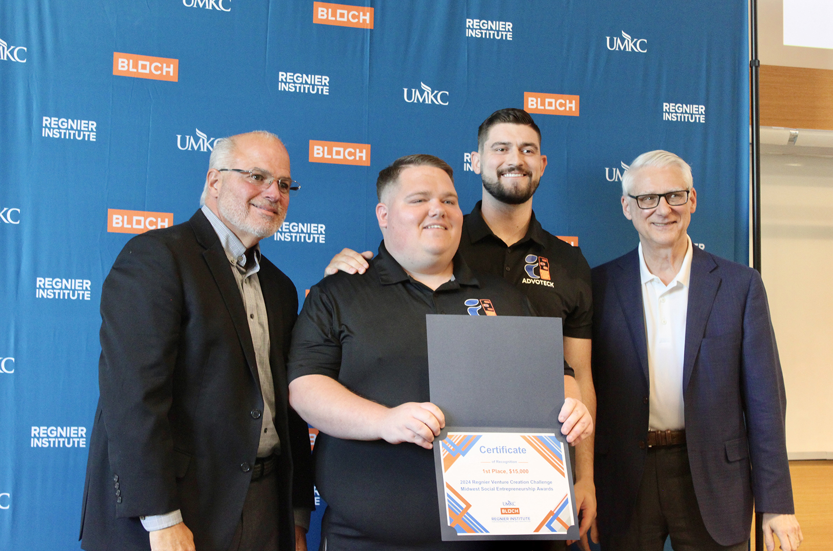 Danny Moran and Bryce Wolff, Advoteck, pose with Jeff Hornsby and Bob Regnier during the awards presentation for the 2024 University of Missouri-Kansas City’s Regnier Venture Creation Challenge; photo by Startland News
