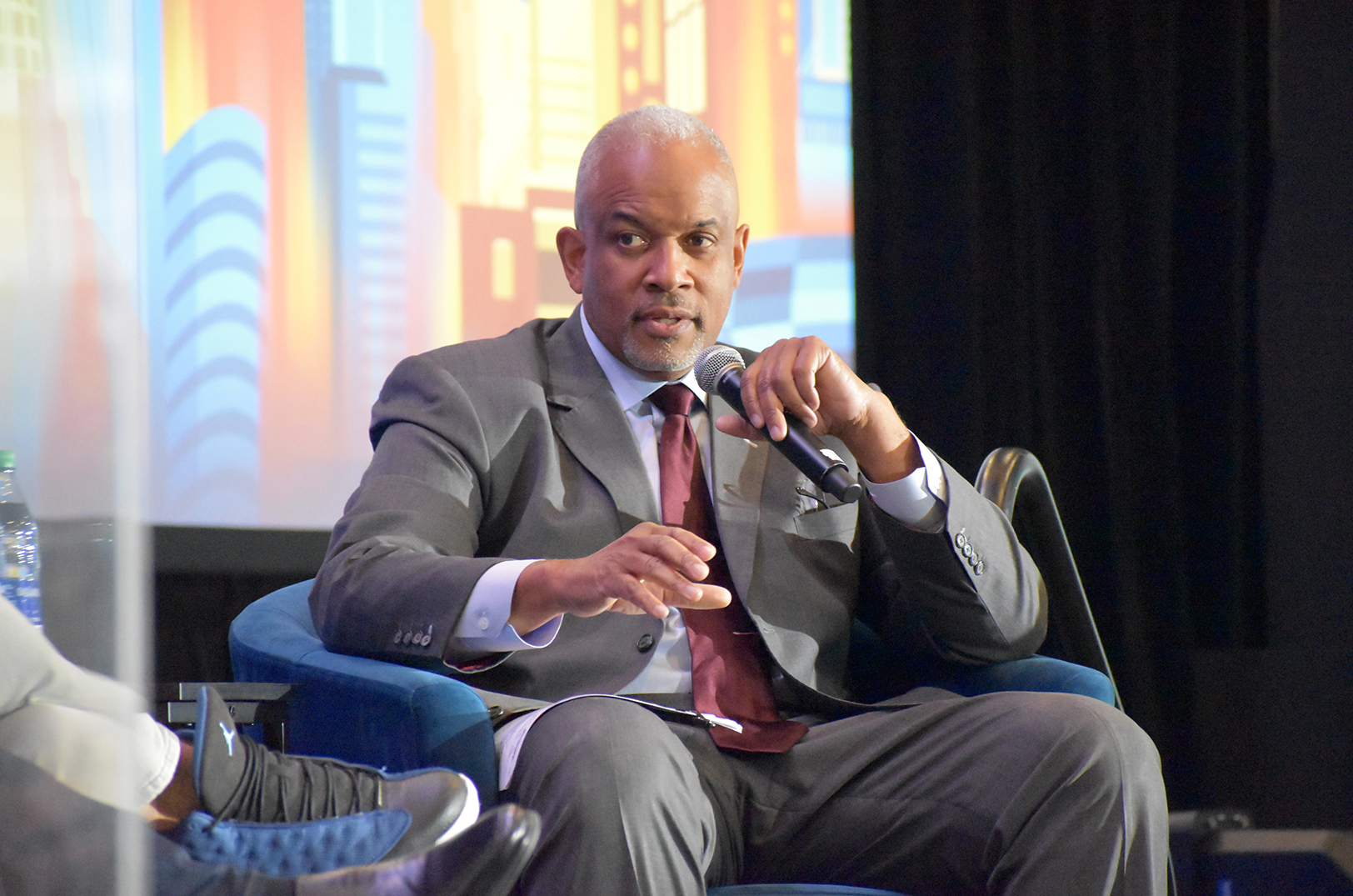 Tracey Lewis, president and CEO of the Economic Development Corporation of Kansas City (EDCKC), speaks in October 2023 at the Downtown KC Office Summit; photo by Taylor Wilmore, Startland News