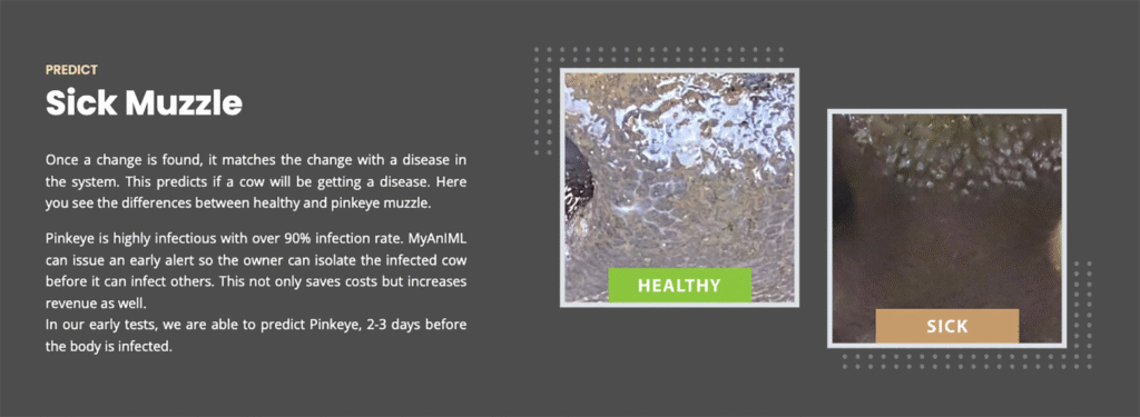 MyAnIML’s patented technology uses artificial intelligence and machine learning to predict a broad range of total health indicators. It’s the industry’s first facial — specifically a cow’s muzzle — recognition library dataset, designed and built by the MyAnIML team. The technology accurately predicted Infectious Bovine Keratoconjunctivitis (IBK), or bovine pinkeye, 99.4 percent of the time and several days before veterinarians were able to detect symptoms, according to the USDA published study results.