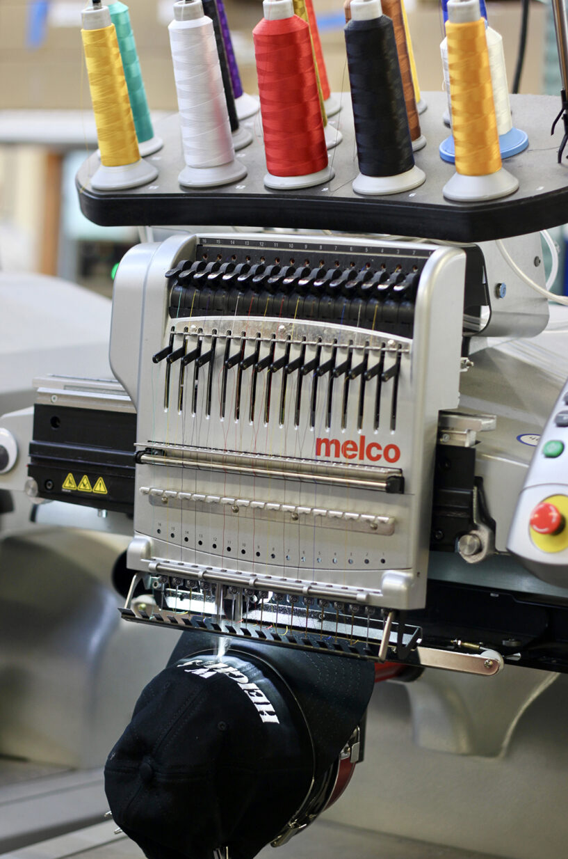 A machine at Sandlot Goods embroiders a New Heights podcast dad hat at Sandlot’s Southwest Boulevard headquarters; photo by Nikki Overfelt Chifalu, Startland News