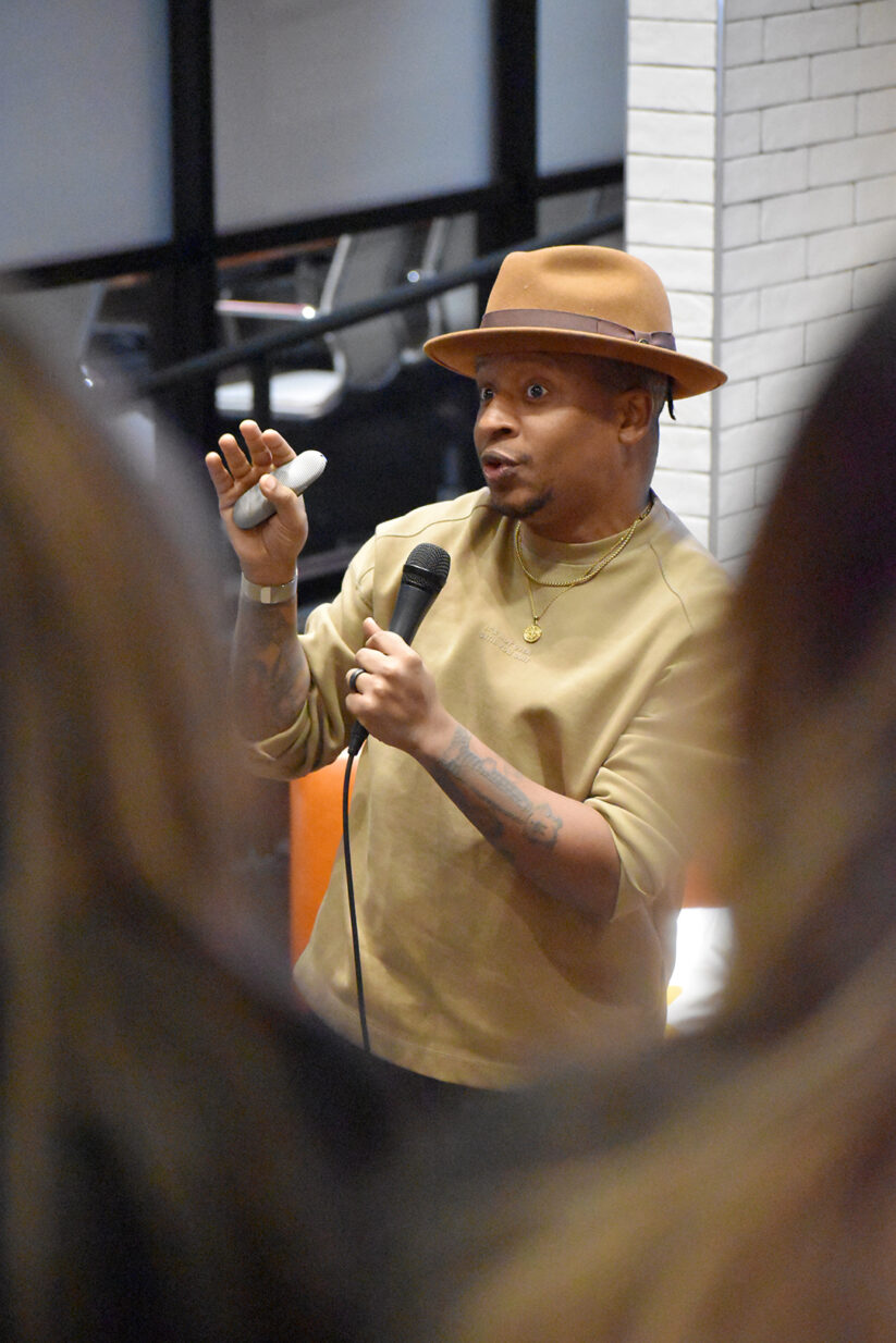 JQ Sirls, Storytailor, addresses the crowd for Startland News’ SLN Live session in December 2023; photo by Tommy Felts, Startland News
