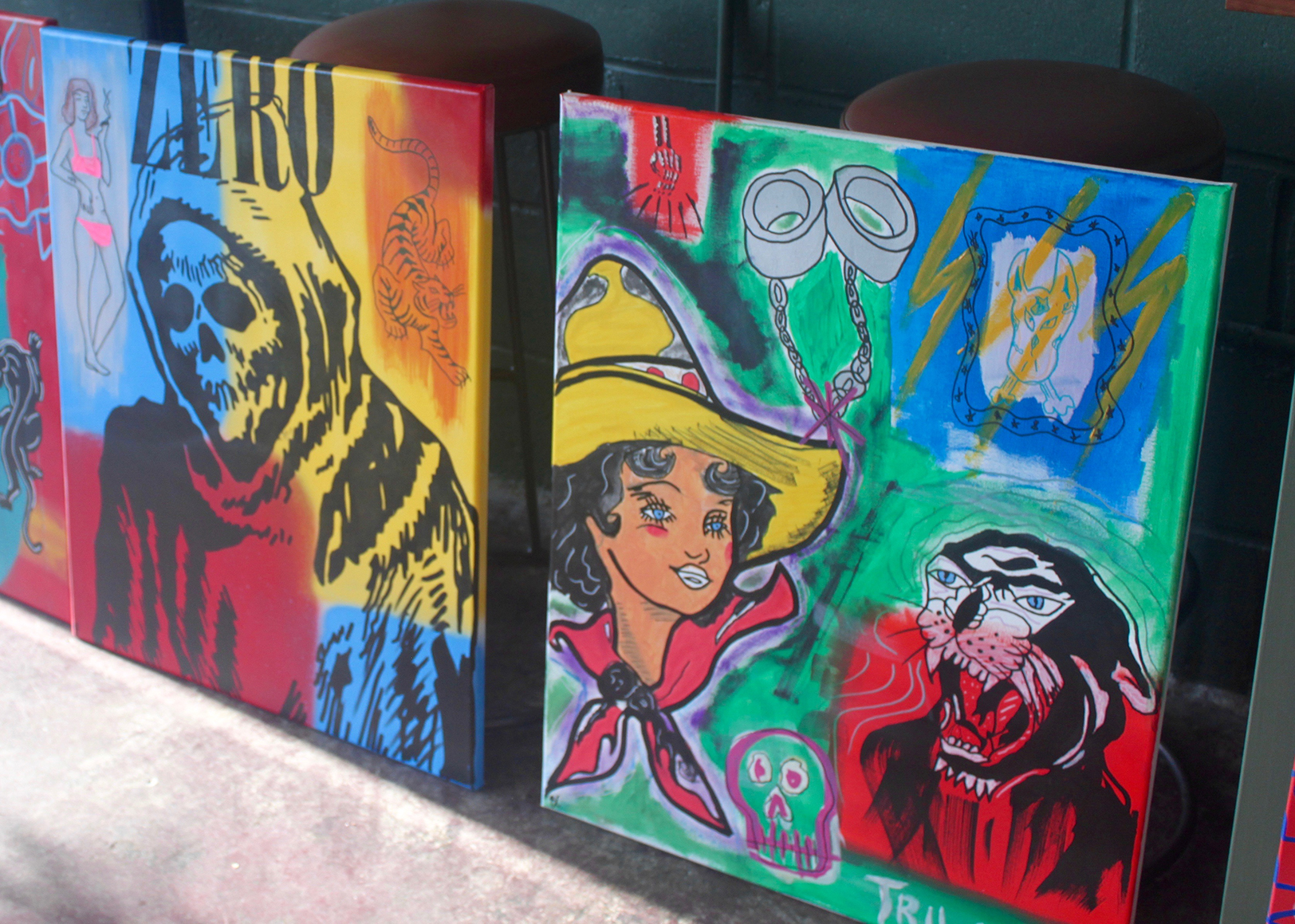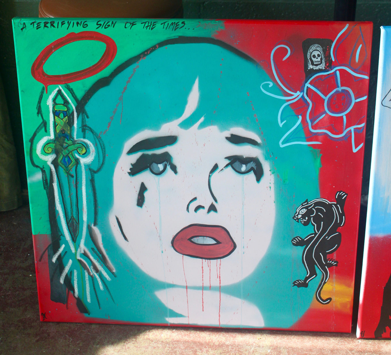 A perfect example, he explained, is his painting featuring a stencil of a tragic comic book girl that a reader might find in a teen romance comic, which mimics pop art iconography. Around her are images that are seen a lot in tattoo flash culture like a skull, a rose, a panther, and a dagger.