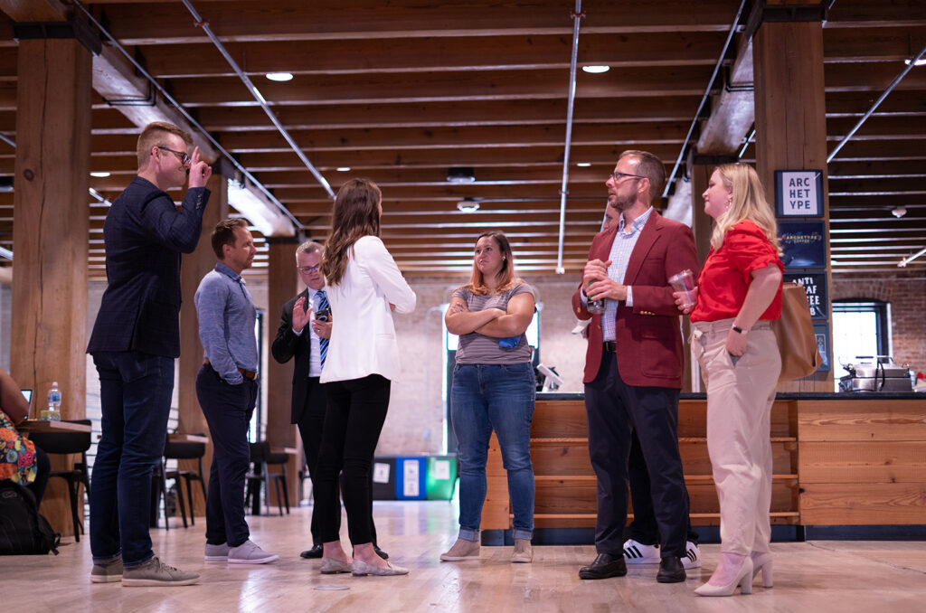 Founders in the 2022 NMotion Growth Accelerator cohort mingle at a recent announcement event; photo courtesy of Scott Henderson, NMotion