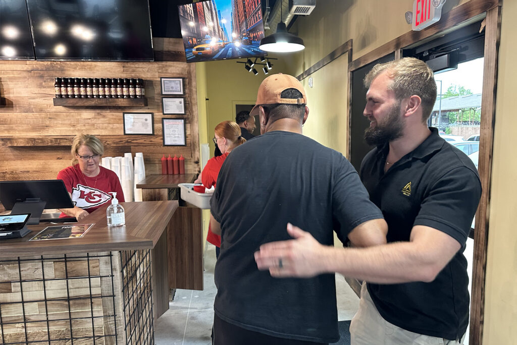 Wardell Hooks Jr. shares a hug with a diner at the soft opening for Off the Hook BBQ; photo by Joyce Smith