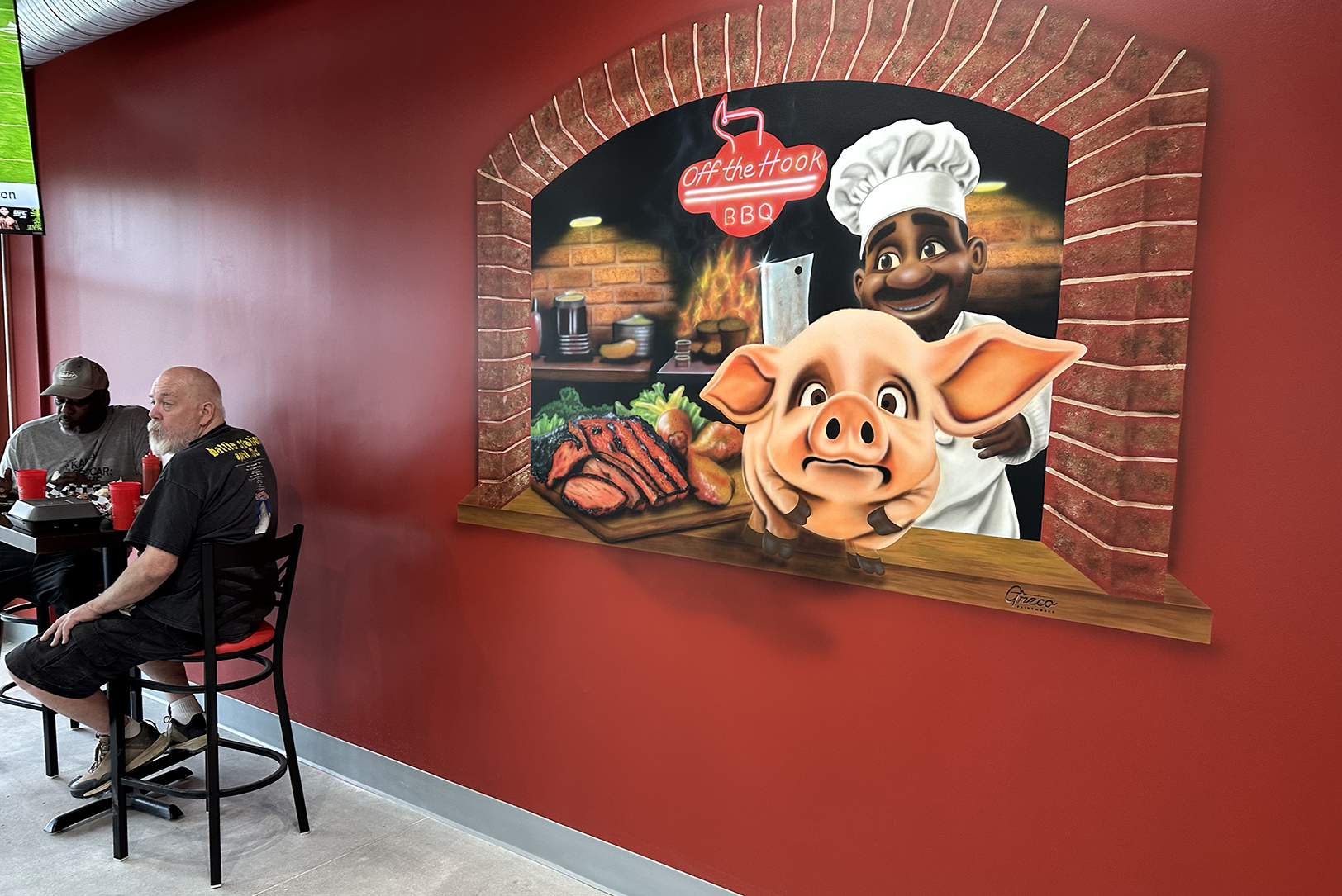 As Off the Hook BBQ gets its footing, the expanded menu is expected to include cheeseburgers, chicken chunks, a four-cheese mac and cheese topped with brisket; loaded baked potato, nachos with a choice of meat, onion straws, potato skins, and quesadillas with brisket/pork/chicken, pepper jack and candied jalapeno sauce. Kids meals also are planned.