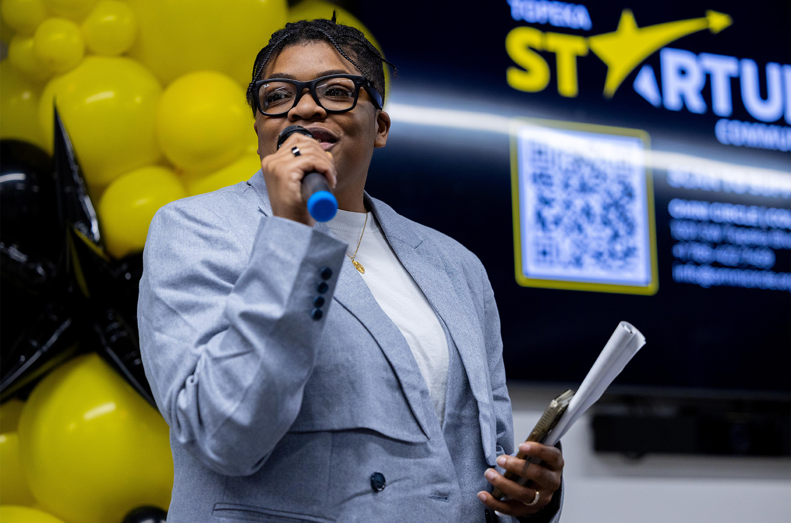 Jannae Gammage, co-founder of Cyphr, speaks during a Topeka Startup Community launch event at Omni Circle in Topeka; photo courtesy of Omni Circle