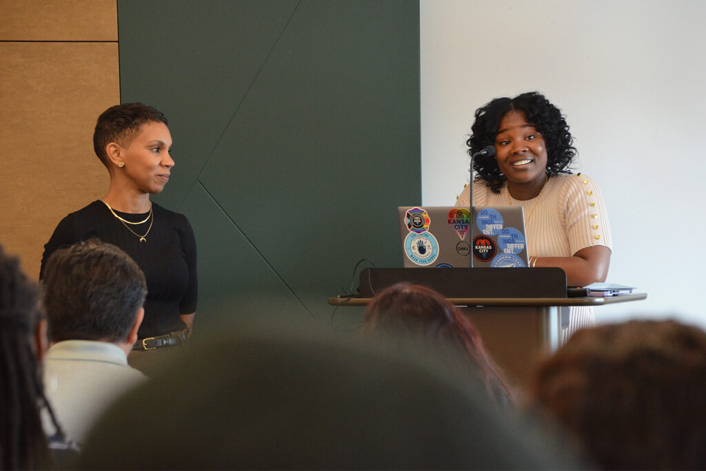 Nia Webster, assistant director of the Neighborhood Services Department for KCMO, and Janá Wagner, division manager for the KC BizCare office, lead a World Cup ESO Lunch and Learn session in September at City Hall; photo by Tommy Felts, Startland News