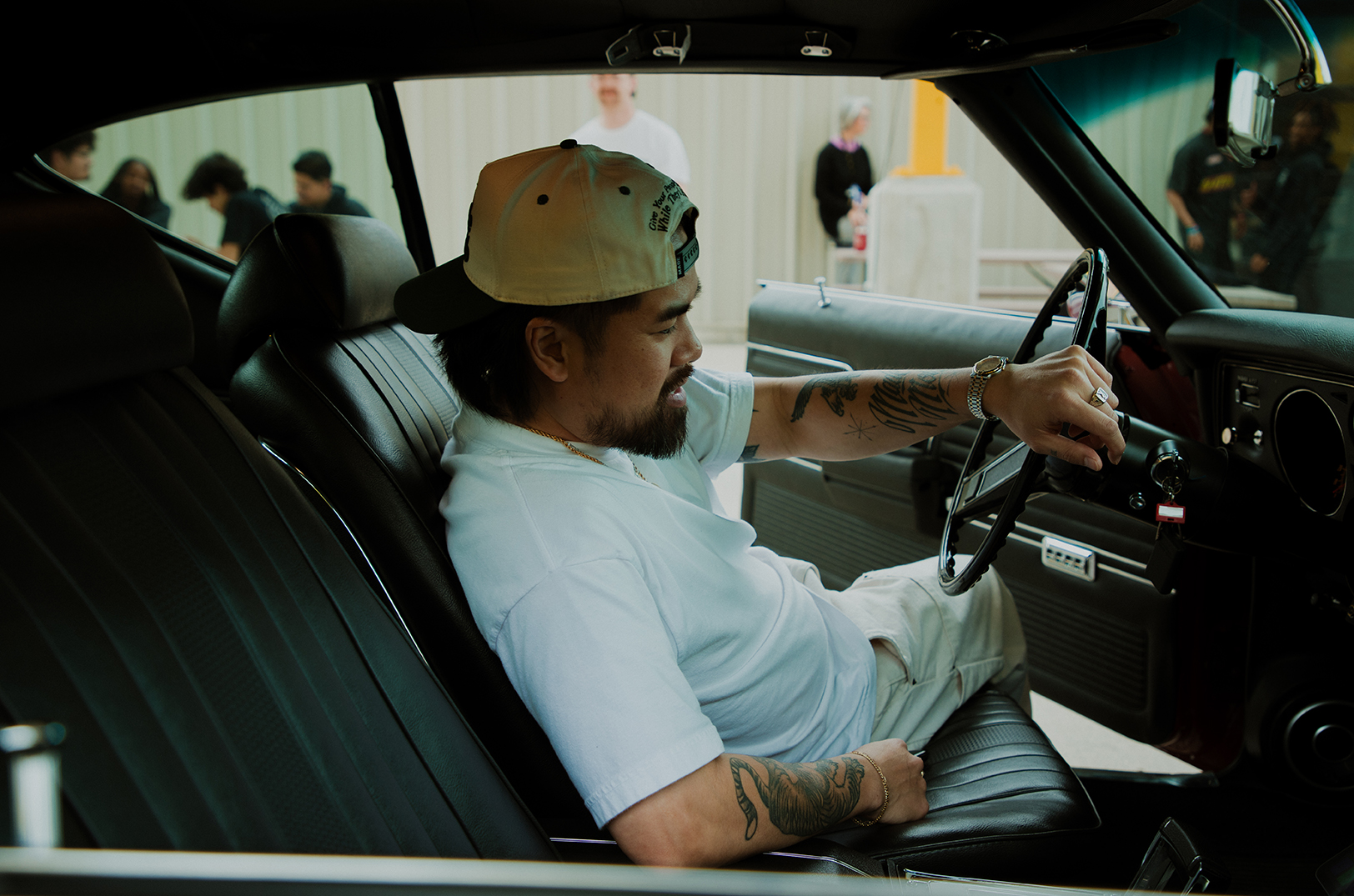 Vu Radley, MADE MOBB, sits inside a 1969 Chevy Chevelle SS that the students in the MindDrive program converted into an electric vehicle for Kansas City Chiefs play Travis Kelce, whose 87 & Running Foundation powers the Ignition Lab; photo courtesy of MADE MOBB