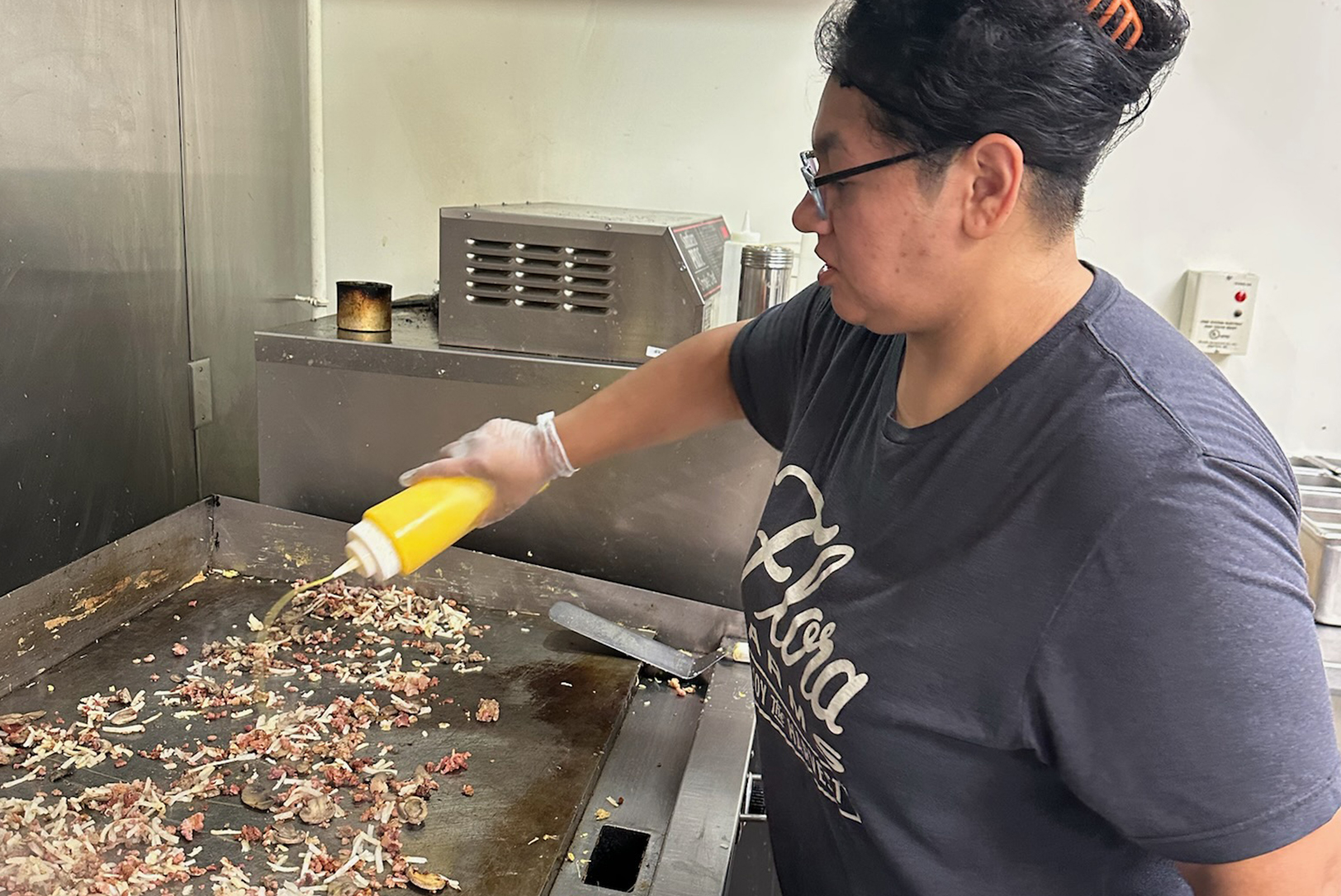 Amanda True, co-owner of Wake & Bacon, whips up scrambled eggs for the company’s breakfast burrito; photo by Joyce Smith