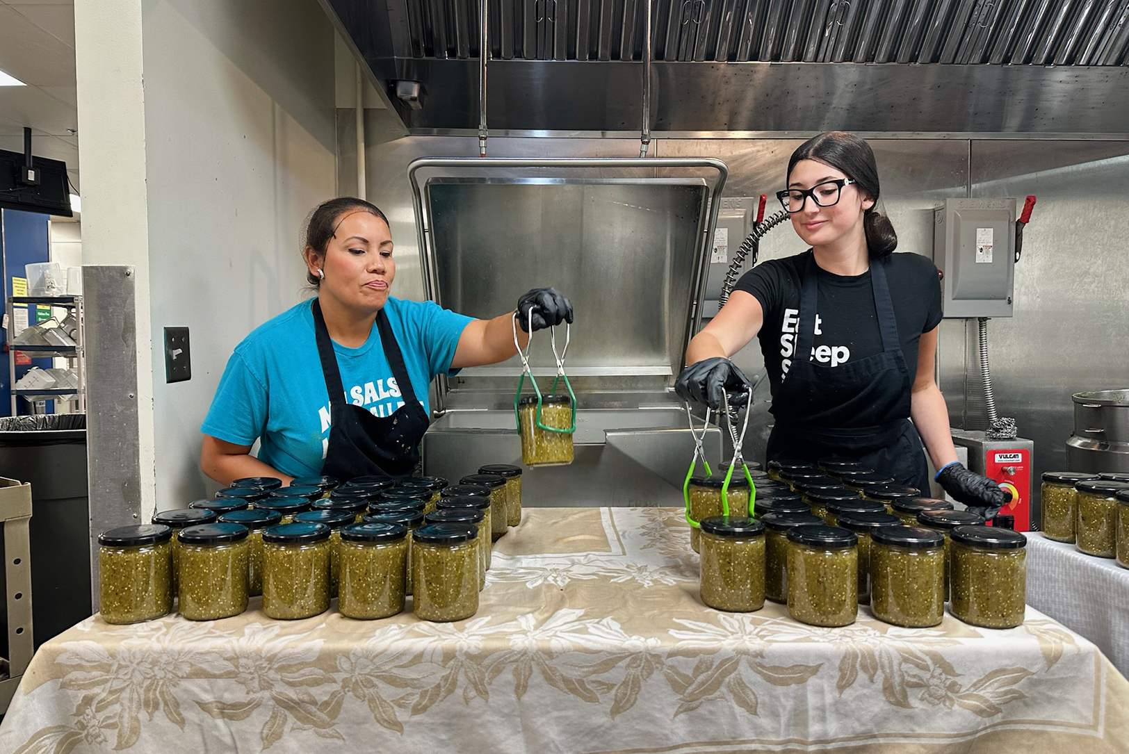 Veronica Chavez, CEO and founder of Palomino’s Salsas & Tamales, cans salsa verde with Malina McMurray, assistant chef, at the Ennovation Center in Independence; photo by Joyce Smith