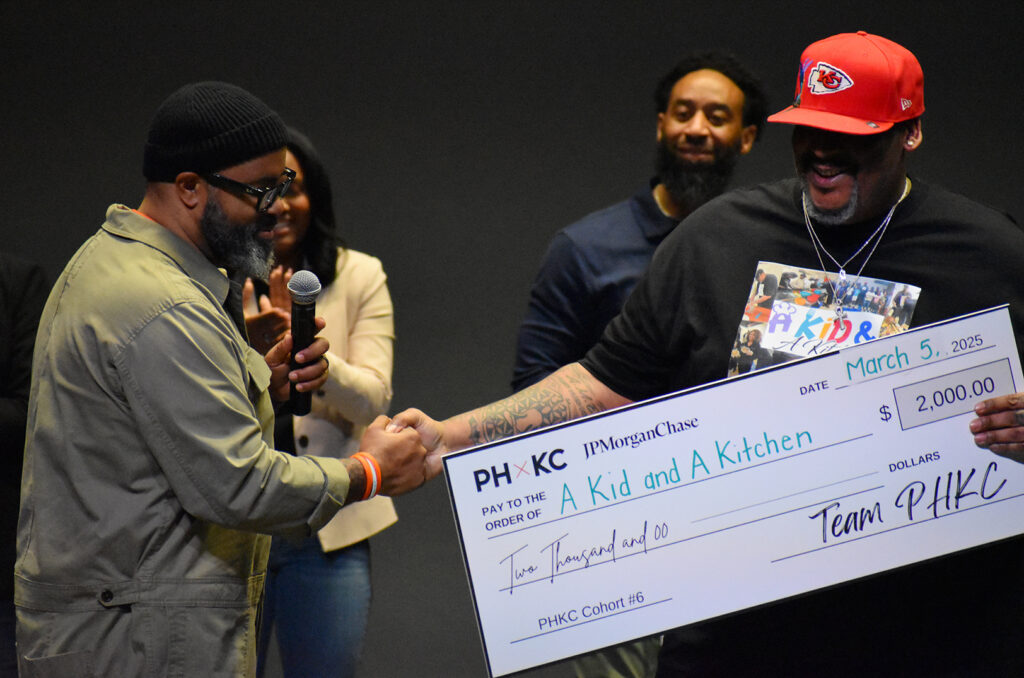 Adell Kirkwood III, founder of A Kid and a Kitchen, accepts the second-place award during The Porter House KC’s pitch competition; photo by Taylor Wilmore, Startland News