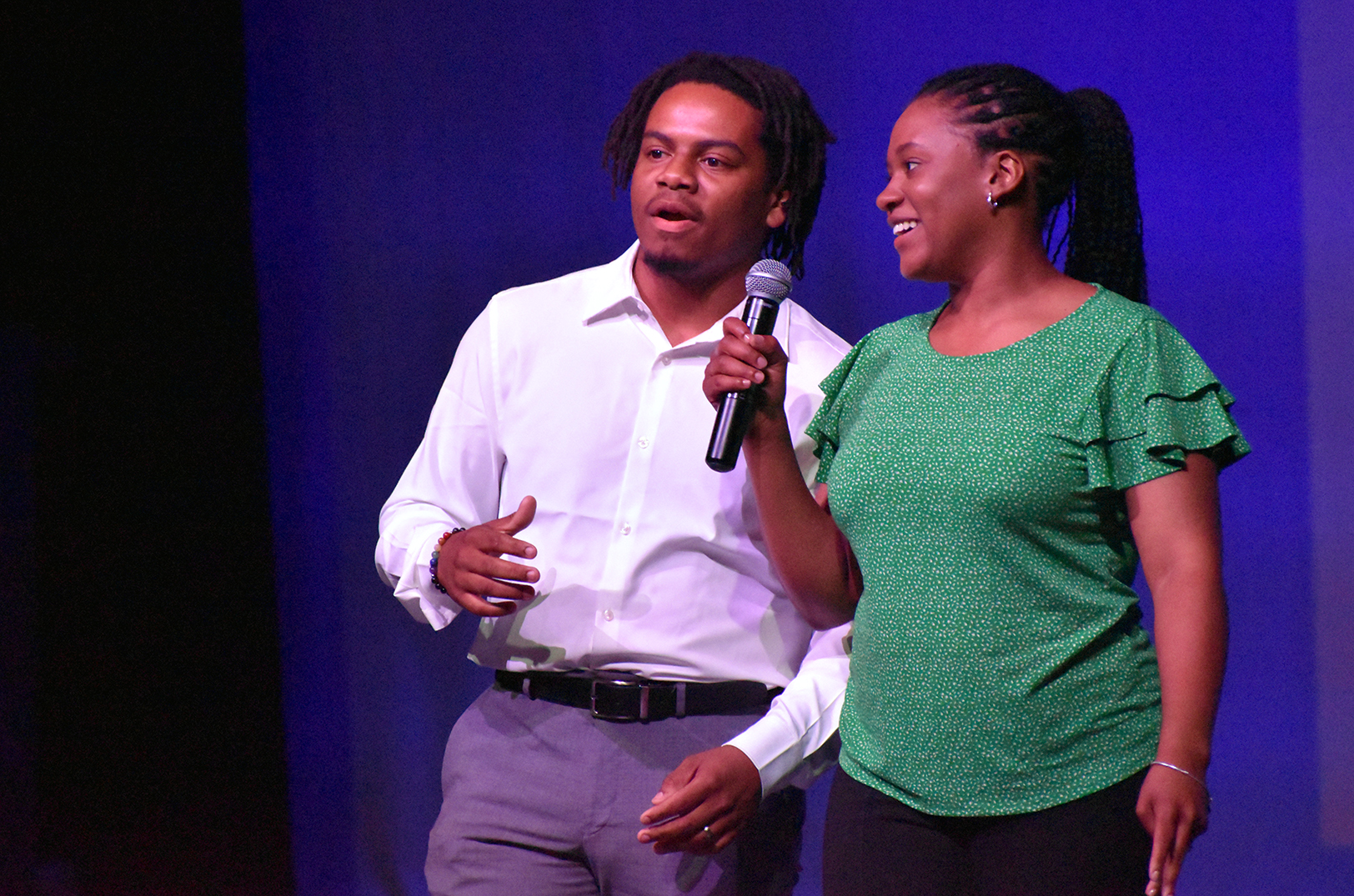 James Spikes and Taylor Burris, AI Hub, pitch on stage at the Gem Theater during The Porter House KC’s Pitch Night; photo by Austin Barnes, Startland News