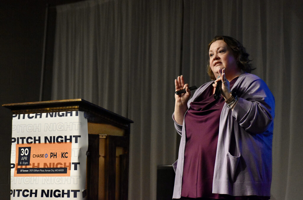 Angela Hughes pitches during the Porter House KC’s Pitch Night event; photo by Nikki Overfelt Chifalu, Startland News